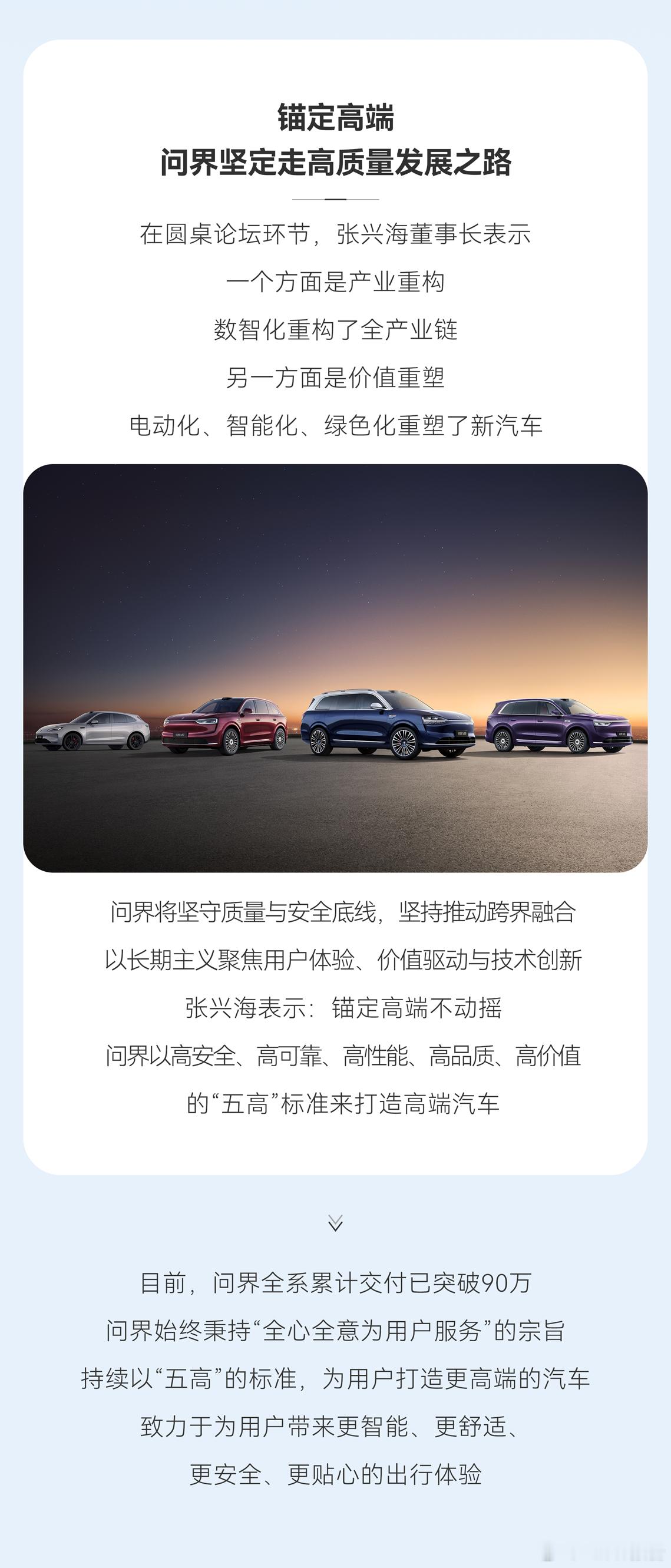 问界用“五高”标准打造高端汽车12月9日,鸿蒙智行携手“五界”联袂登场央视新闻《超凡一步》——在一起,鸿蒙智行!问界以高安全、高可靠、高性能、高品质、高价值“五高”标准锚定高端,精准切中高端用户核心需求。其将安全视为最大豪华,构建覆盖190余项场景的智能安全体系,搭配华为ADS智驾与高强钢车身,筑牢出行防线。依托赛力斯与华为的深度合作,问界以全铝合金底盘、超1400公里综合续航等实现硬核性能,用Nappa真皮座舱、HUAWEI SOUND音响打磨品质细节。这一标准并非空谈,而是源于90万累计交付量的用户反馈沉淀,11月单月交付破5万的成绩便是市场认可。“五高”标准既打破了外资豪华垄断,又以“科技平权”让高端配置触手可及,成为中国品牌高端化的扎实践行者。问界56789产品矩阵将补齐顺子车型终于要凑齐了汽场全开