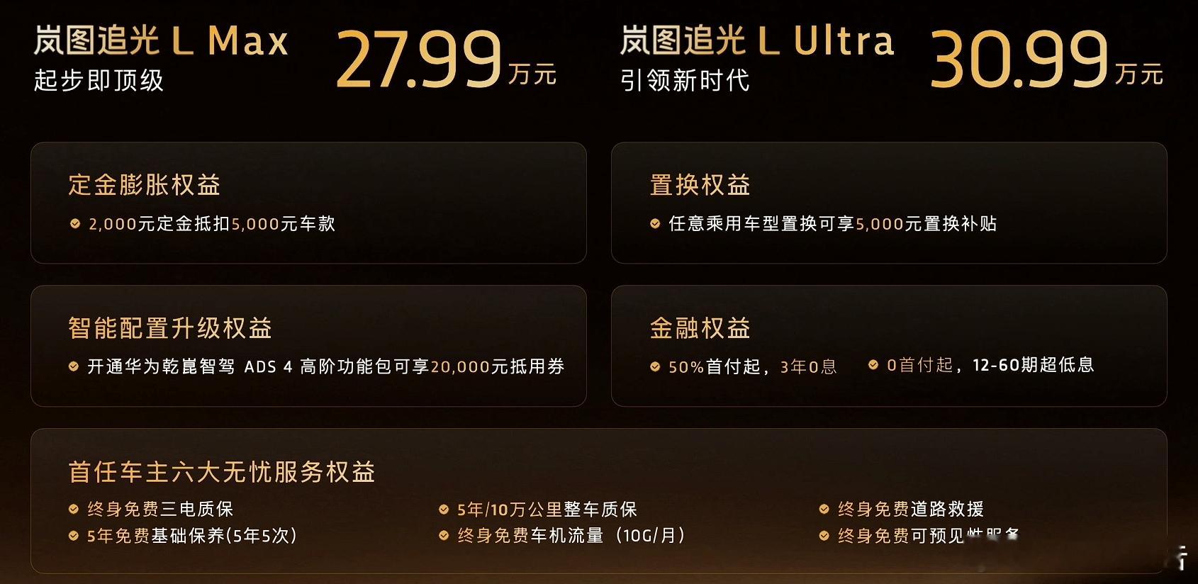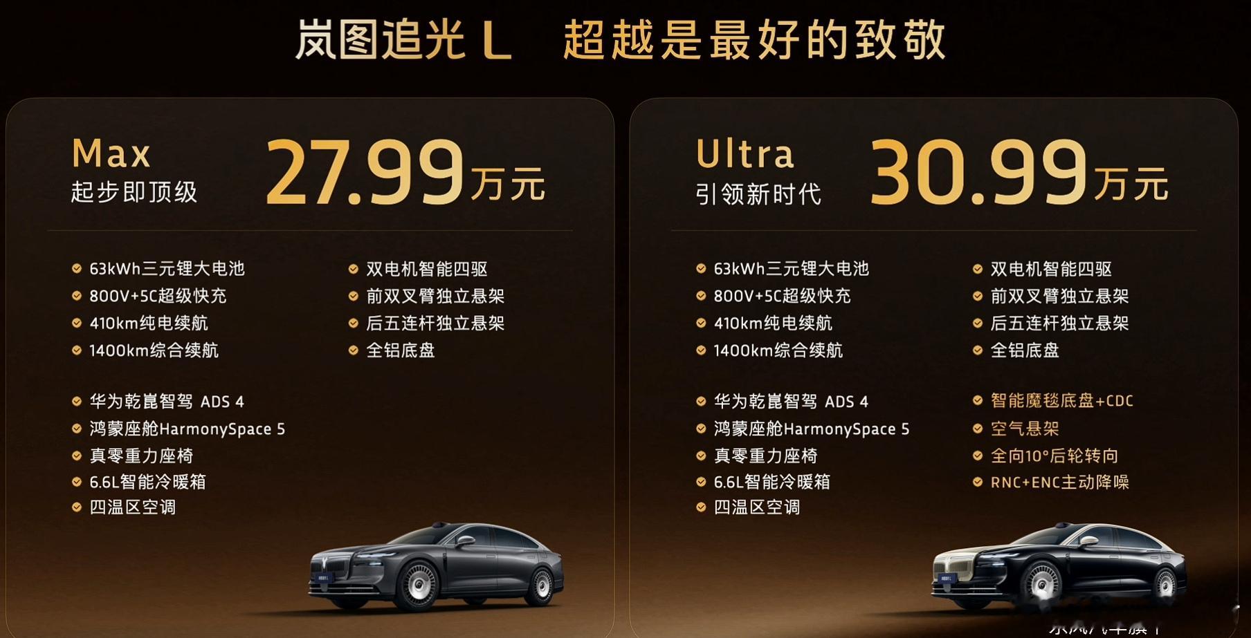 27.99万起岚图追光L压轴上市12月10日,岚图旗舰轿车追光L上市,共推出Max和Ultra两款车型,售价27.99-30.99万元。车身尺寸方面,长宽高为5125*1985*1522(1505)mm,轴距3010mm。内饰方面,搭载最新的鸿蒙座舱系统,配10.25英寸液晶仪表、16.1英寸3K悬浮屏以及AR-HUD,三屏互联。底盘部分,该车标配前双叉臂+后五连杆全铝底盘,Ultra版增加空气悬架+CDC减振,支持10°后轮独立转向,还拥有双主动降噪系统(RNC+ENC)。智能驾驶辅助方面,新车搭载华为乾崑智驾 ADS 4,采用面向未来自动驾驶时代的全新WEWA技术架构,相比ADS 3,ADS 4可实现端到端时延降低50%,通行效率提升20%,重刹率降低70%。动力方面,新车搭载一套由1.5T发动机+双电机组成的插电式混合动力系统,发动机最大功率110kW,电机最大功率150/230kW,馈电零百加速4.8秒,极速181km/h。匹配63kWh超大容量电池,CLTC纯电续航410km,综合续航1400km,基于800V架构打造,充电10分钟,续航增加200公里,20-80%仅需12分钟,并支持外放电功能。30万级豪华轿车首选岚图追光L岚图追光l岚图汽车汽场全开