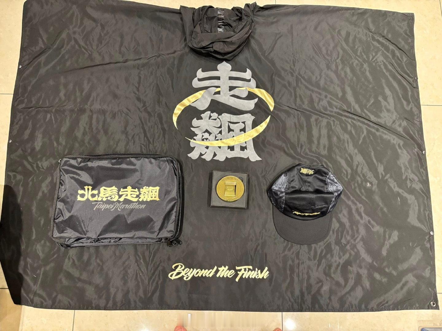 2025台北马拉松金标全马限定组配送到家的参赛物品。图3是台湾统一规格、各赛事可通用的存衣包;图3卷起来的是背心;图6是斗篷/地垫多用。台北马拉松 赛事组织