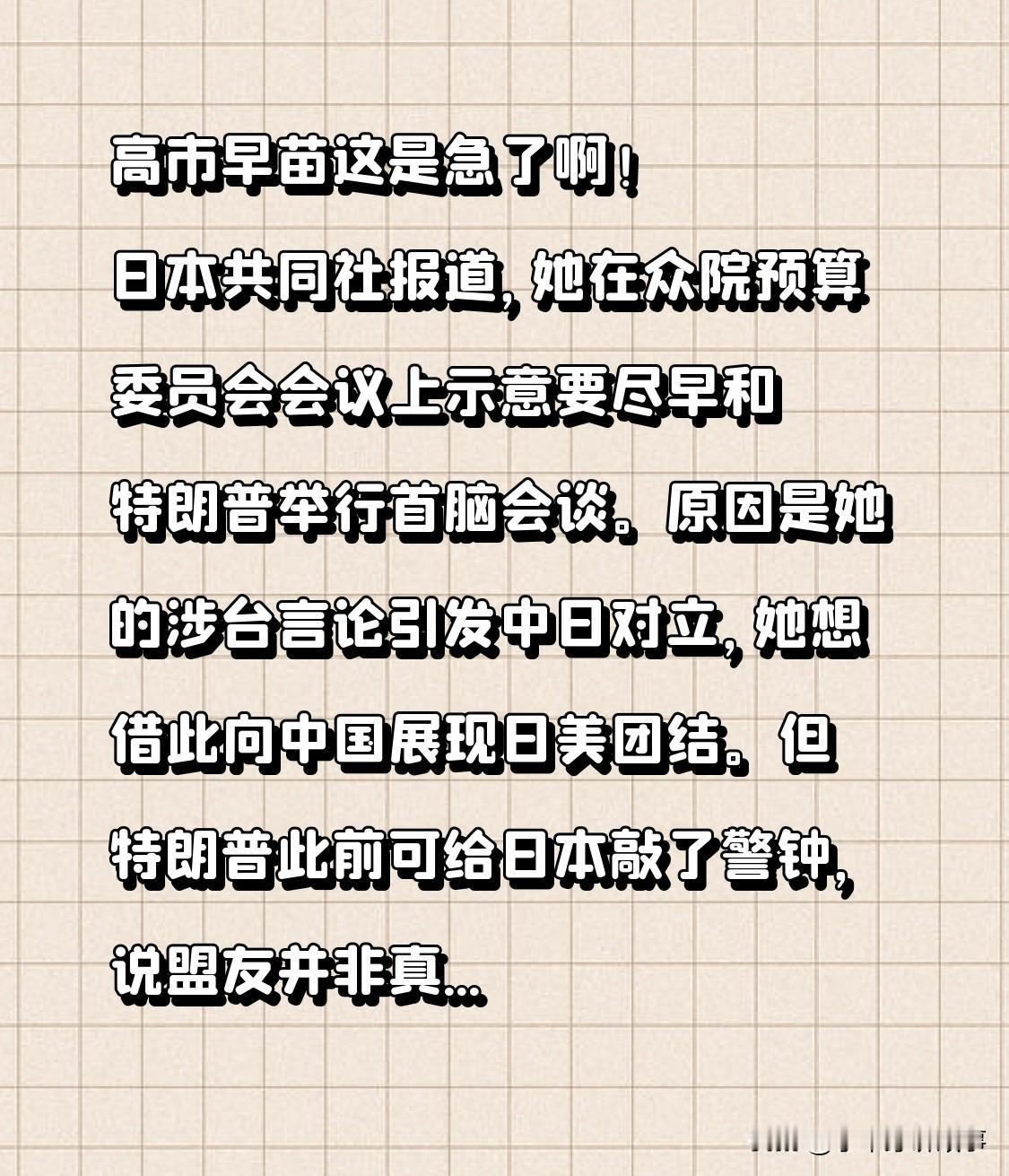 高市早苗这是急了啊!日本共同社报道,她在众院预算委员会会议上示意要尽早和特朗普举行首脑会谈。原因是她的涉台言论引发中日对立,她想借此向中国展现日美团结。 但特朗普此前可给日本敲了警钟,说盟友并非真朋友,贸易上盟友比中国还能“剥削”美国。东京方面觉得要是新首相卷入和中国冲突,美国安全保护伞可能不管用。而且美国也没公开力挺日本,还让高市早苗克制对台言论。她现在求见特朗普,也不知道能不能如愿得到想要的支持,估计是心里没底,慌了才想赶紧抱大腿。