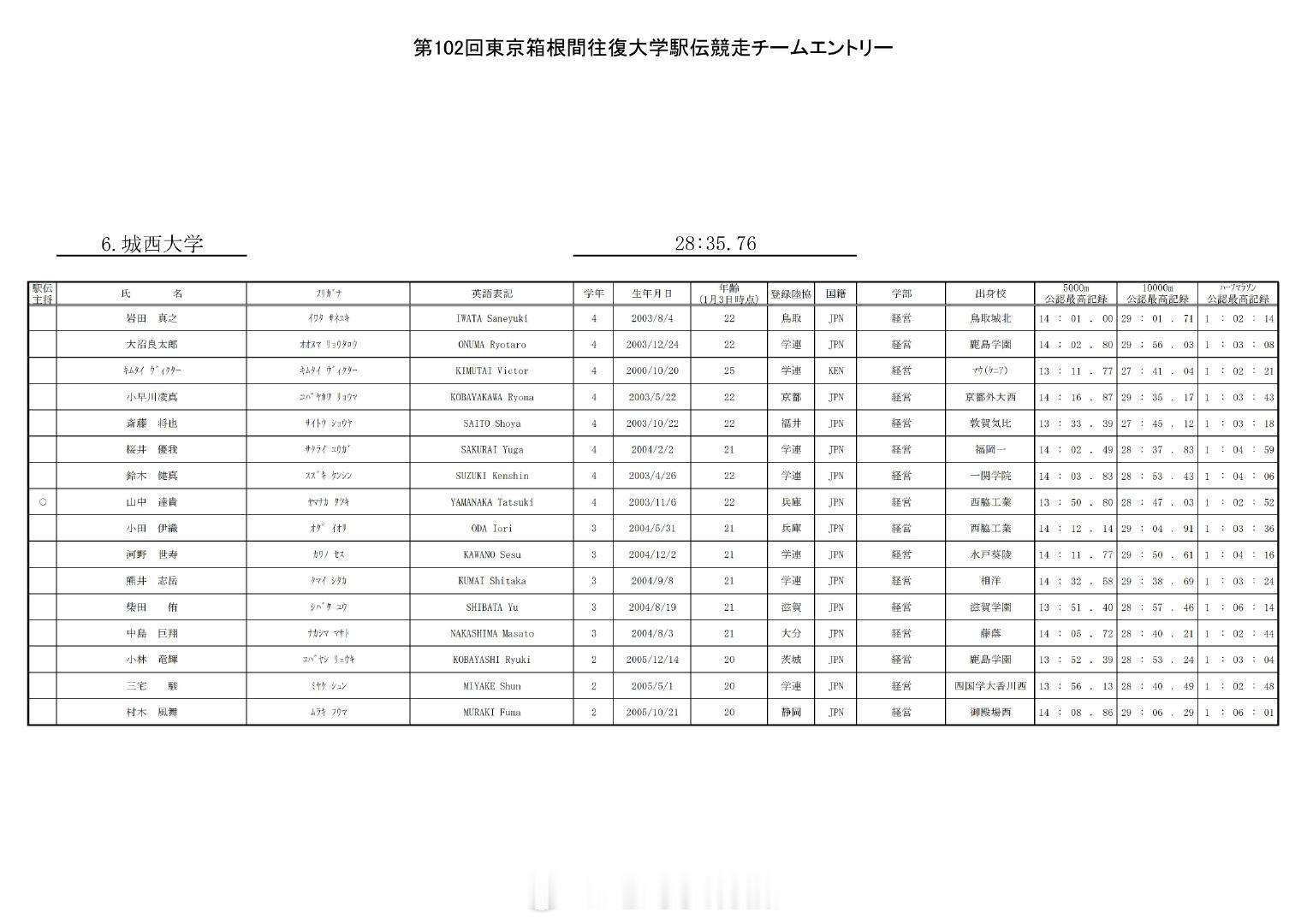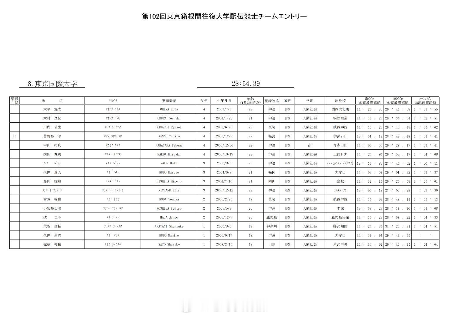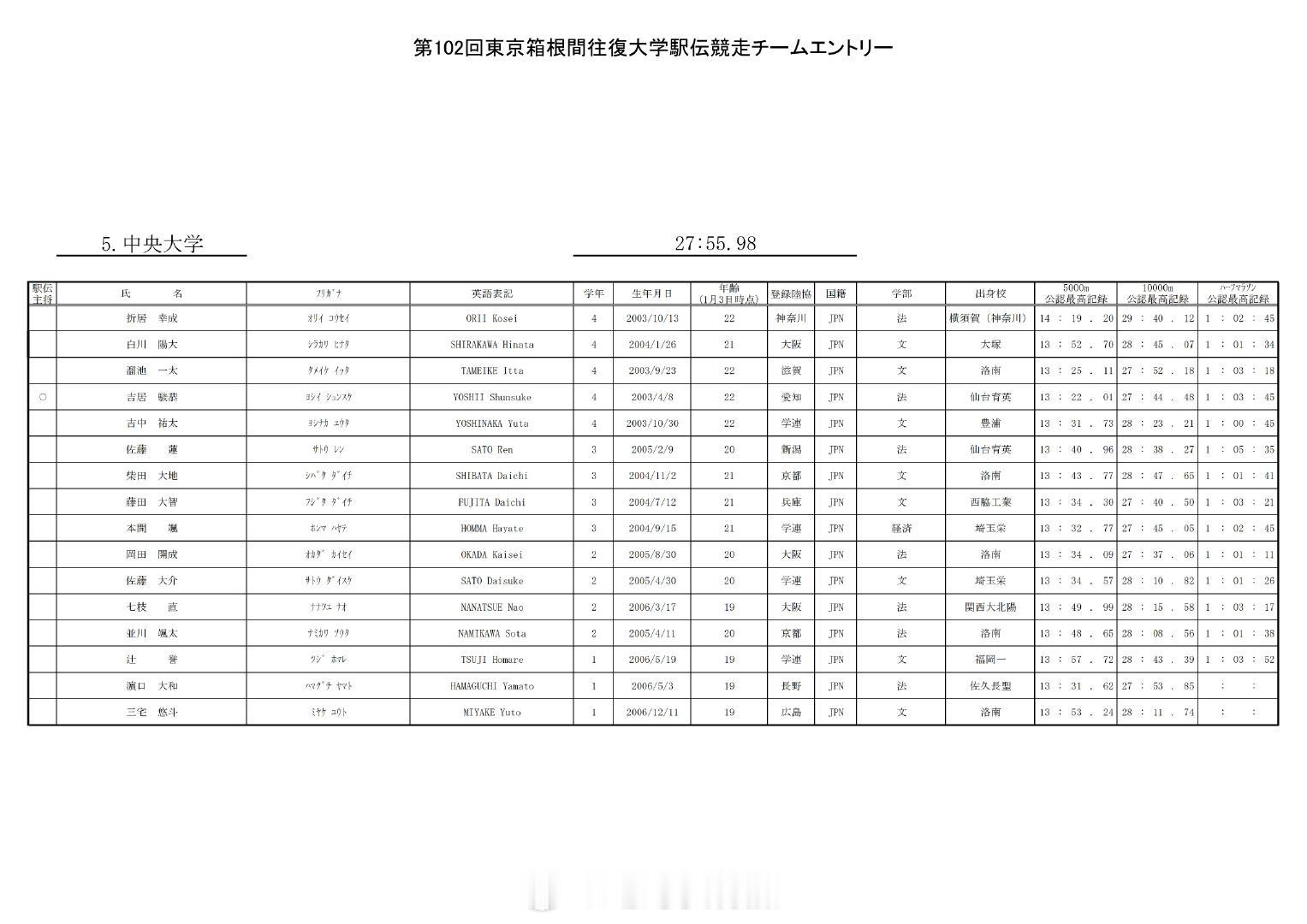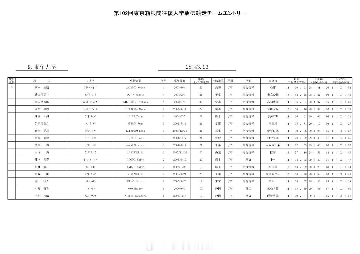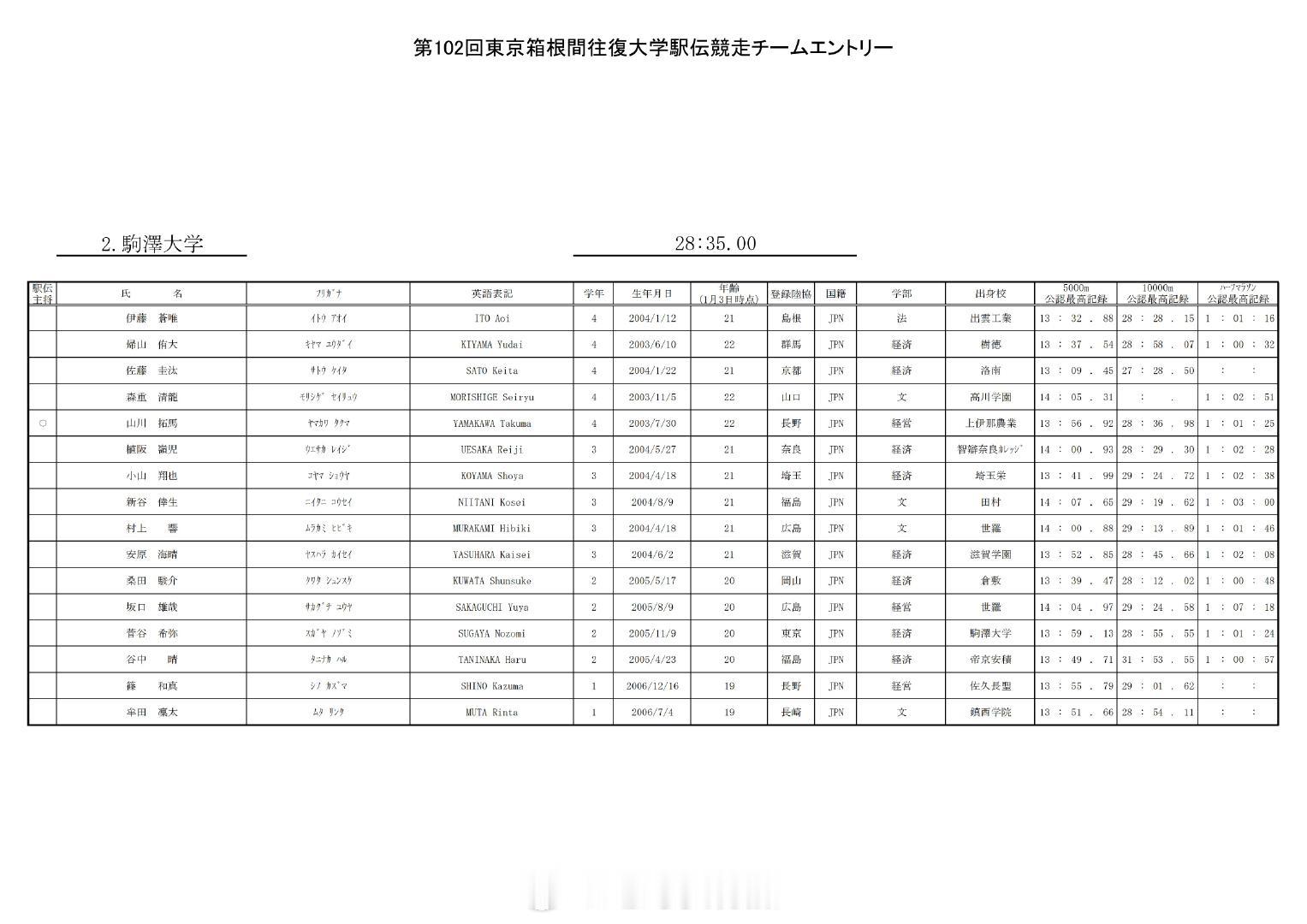 2026年第102回箱根驿传各队16人大名单。估计最终还是黑田朝日、山川拓马、上