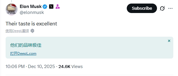 该观点得到了马斯克的回应,他评论道:“他们的品味非常好。”