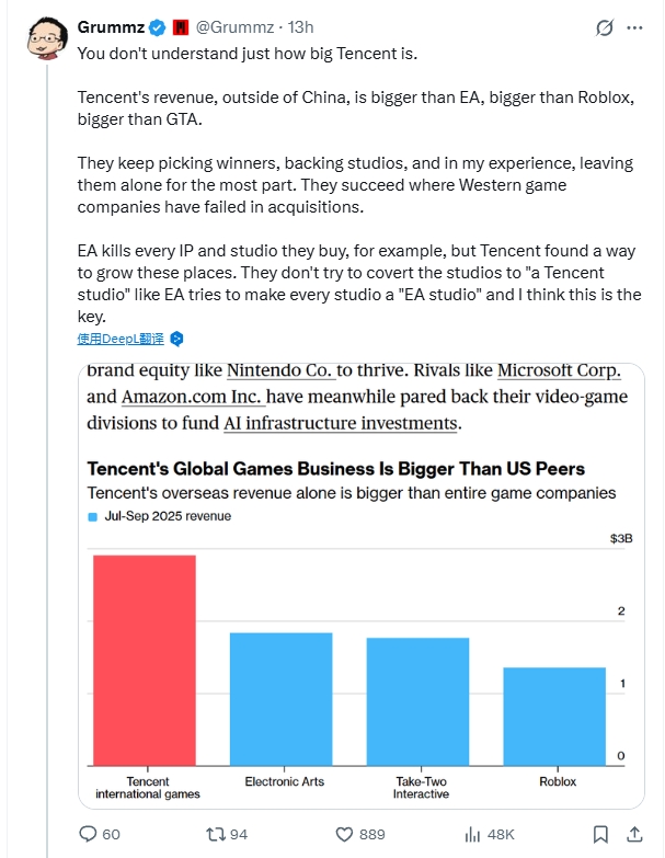 直播吧12月11日讯前《魔兽世界》制作人MarkKern(昵称Grummz)近日在社交平台X上分享了对腾讯的观察。他指出:“很多人并不真正了解腾讯的规模。仅在中国市场以外,腾讯的收入就已超过艺电(EA)、Roblox甚至《GTA》系列的表现。”