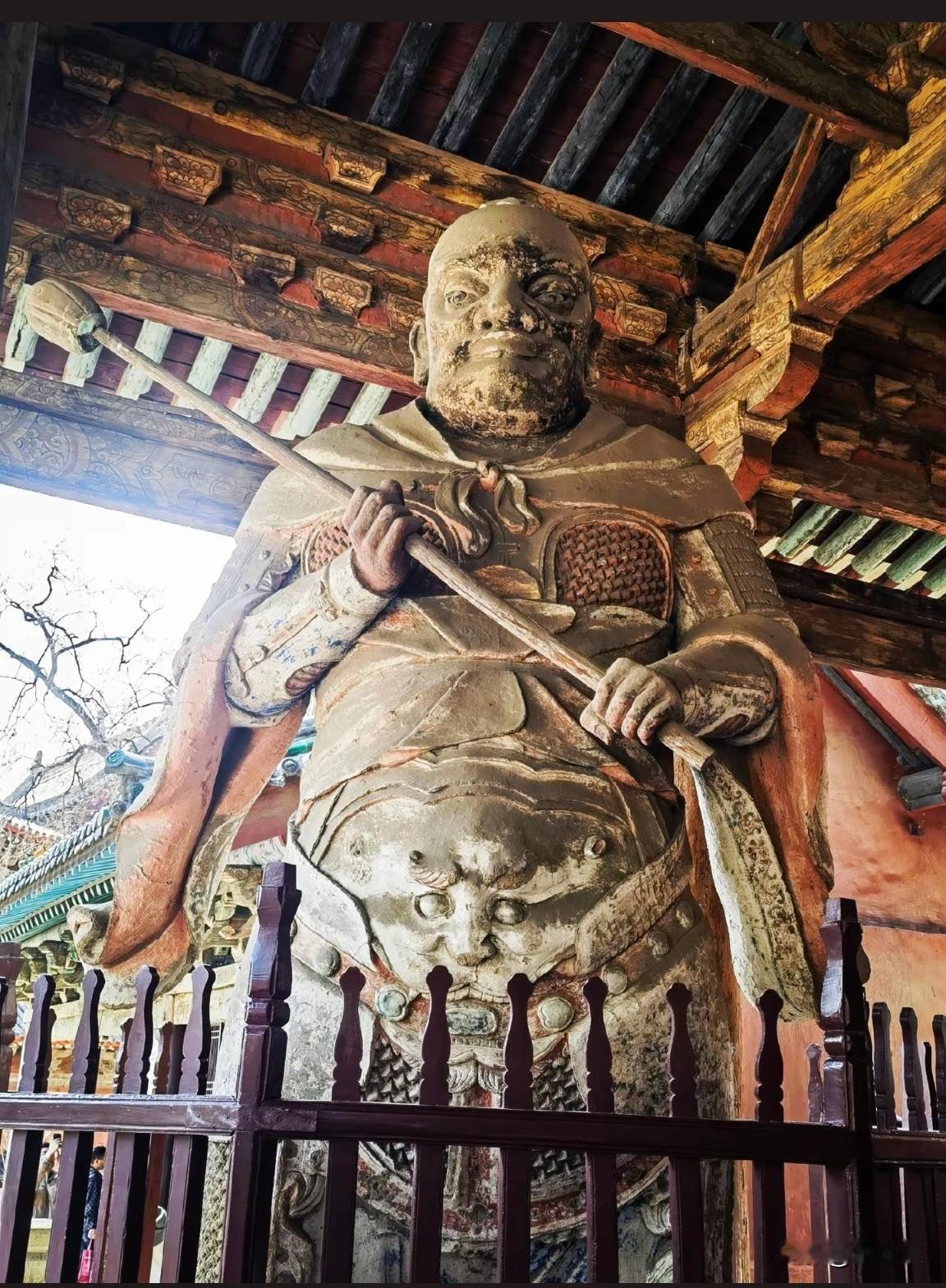 整理照片,发现晋祠圣母殿两侧宋代所塑站殿将军方弼与方相,他俩胸腹部的人面铠甲,与