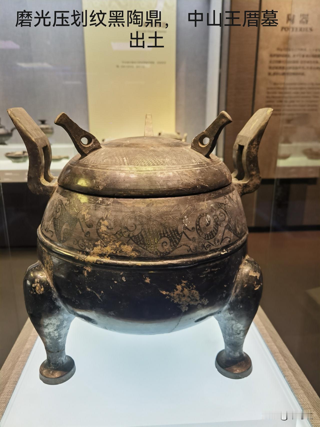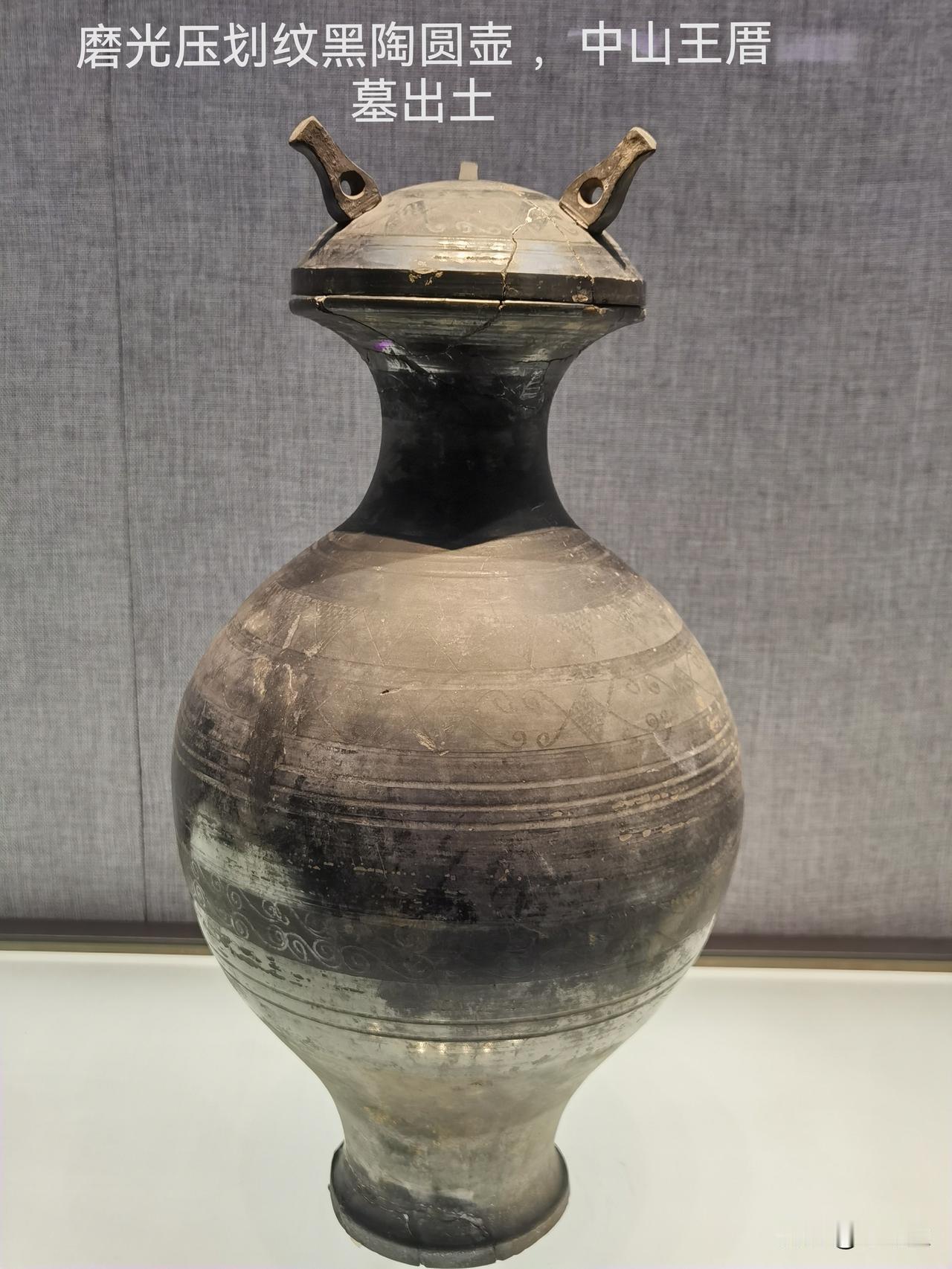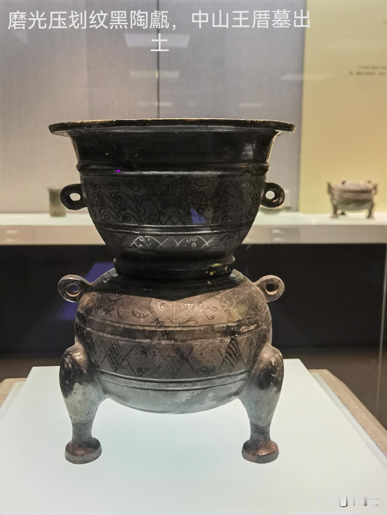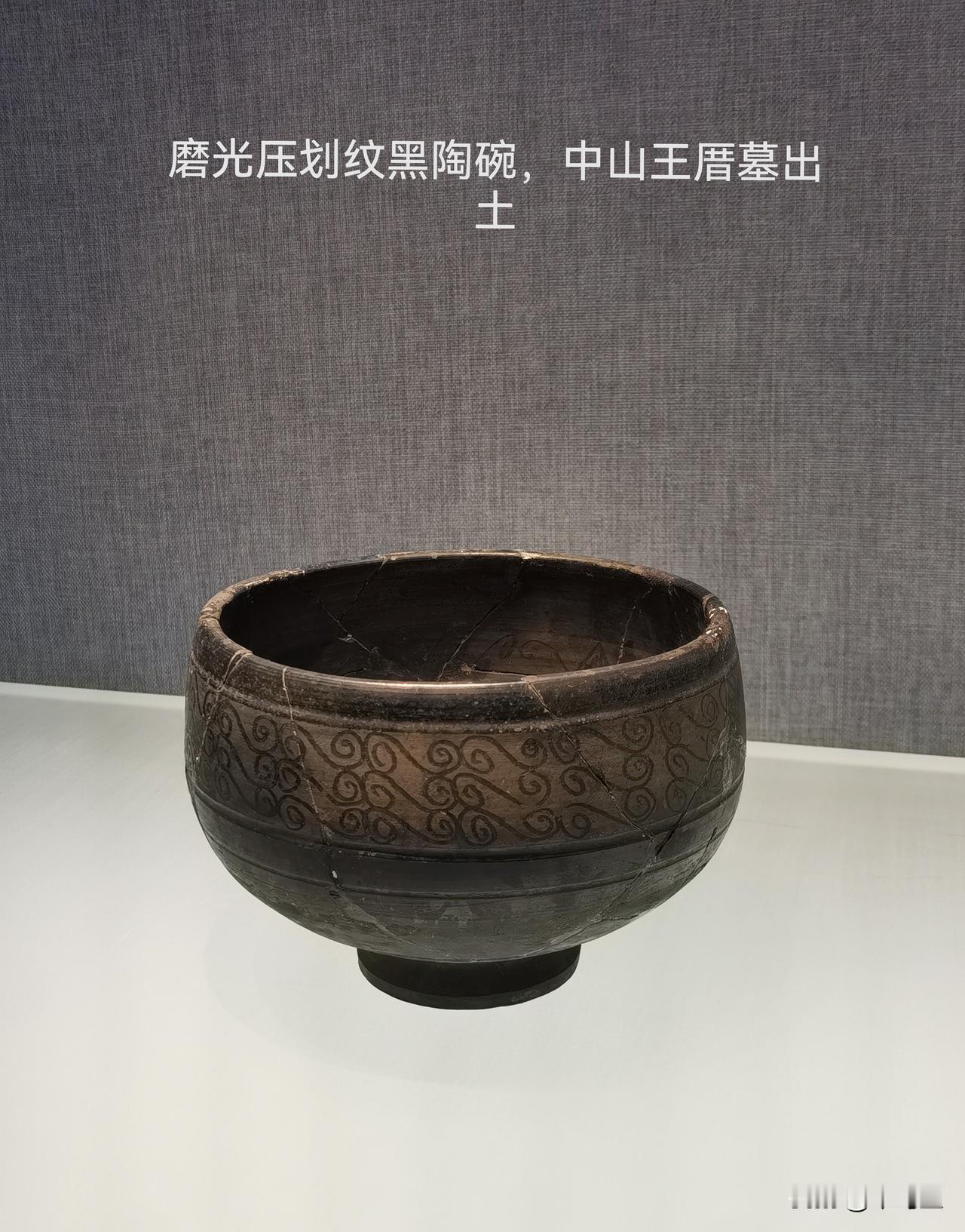 在中山国文物中见到很多磨光压划纹黑陶,造型端庄,纹饰典雅,有种温润的质感。 这种黑陶是专为随葬制作的礼仪明器。是在继承龙山文化核心工艺的基础上,进行的再创造,数量稀少,工艺精湛。 制作时要在半干陶坯上,用尖细硬滑的工具压划出各种图案轮廓,再把凹槽边缘进行打磨,这样就会形成光亮黑线。 在陶器烧制的最后阶段,将窑炉密封,阻断空气进入,使窑内产生大量浓烟。这些碳颗粒渗入陶器的孔隙中,从而将其染成深黑色。 接下来再分区进行磨光处理,经过压磨的花纹部分形成光亮的黑,其他部分是哑光的黑,这样就形成了中山国特有的磨光压划纹黑陶。 中山磨光压划纹黑陶既是对古老制陶工艺的致敬与复兴,又是自身文化认同和政治诉求的鲜明体现。 中山国上层贵族通过这一高度华夏化的方式,表明自己不再是“蛮狄”,而是与中原诸侯无异的文明之邦。