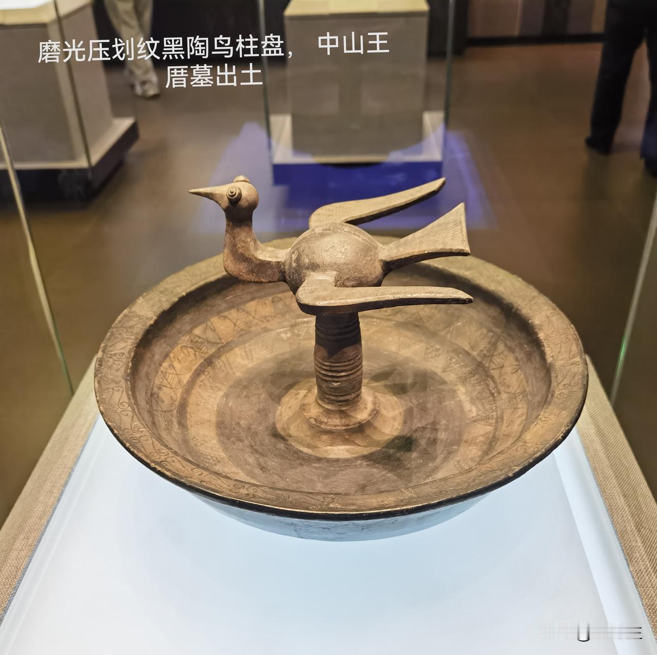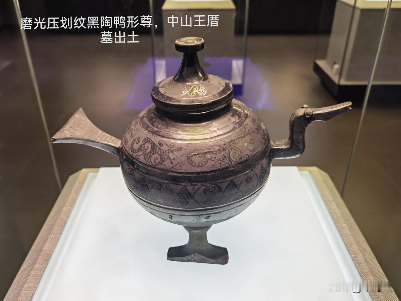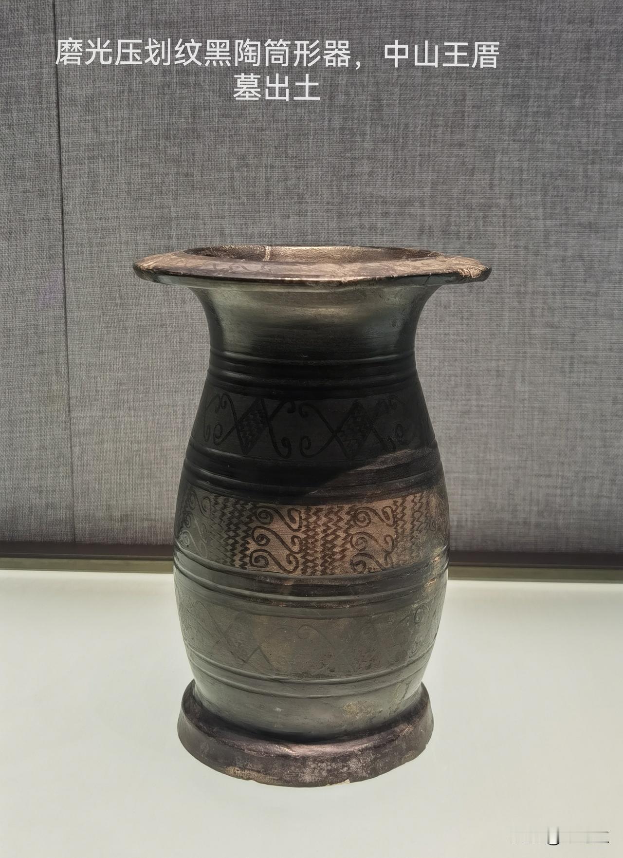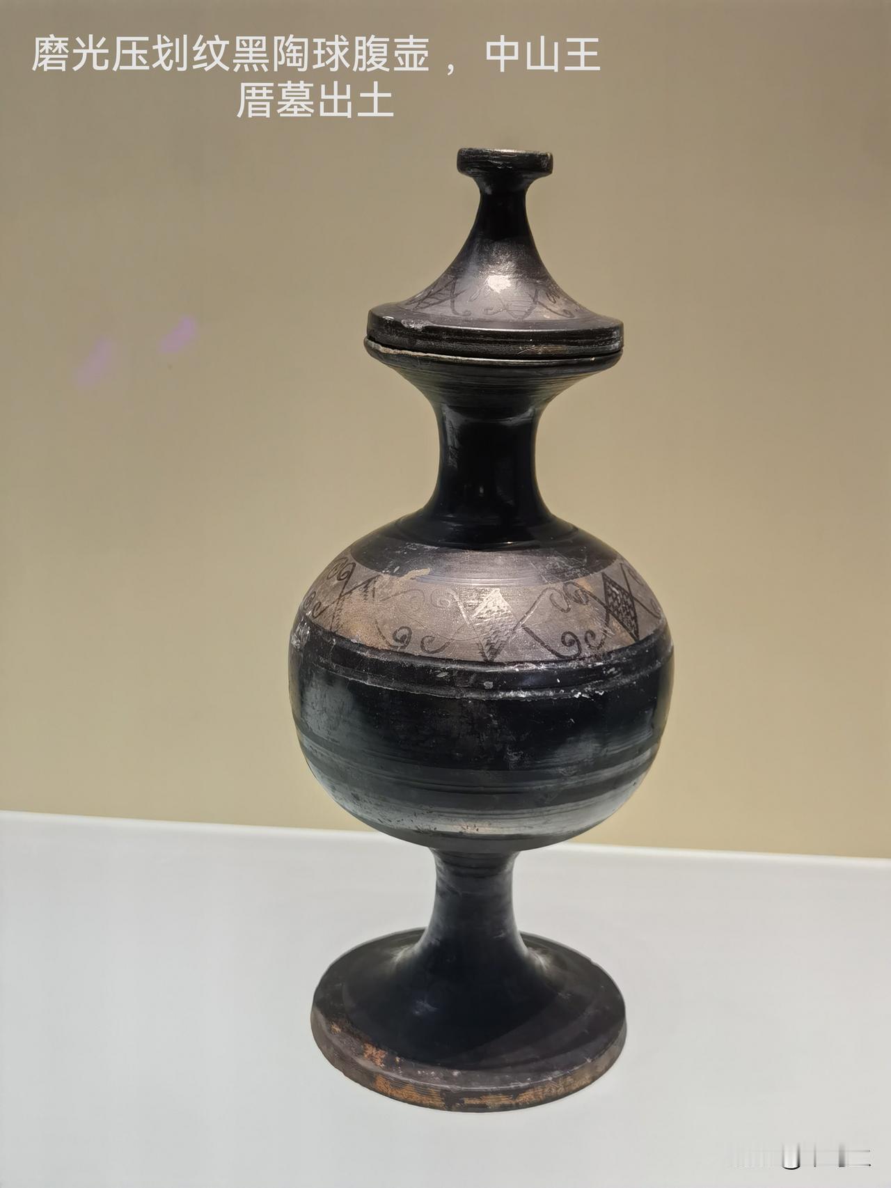 在中山国文物中见到很多磨光压划纹黑陶,造型端庄,纹饰典雅,有种温润的质感。 这种黑陶是专为随葬制作的礼仪明器。是在继承龙山文化核心工艺的基础上,进行的再创造,数量稀少,工艺精湛。 制作时要在半干陶坯上,用尖细硬滑的工具压划出各种图案轮廓,再把凹槽边缘进行打磨,这样就会形成光亮黑线。 在陶器烧制的最后阶段,将窑炉密封,阻断空气进入,使窑内产生大量浓烟。这些碳颗粒渗入陶器的孔隙中,从而将其染成深黑色。 接下来再分区进行磨光处理,经过压磨的花纹部分形成光亮的黑,其他部分是哑光的黑,这样就形成了中山国特有的磨光压划纹黑陶。 中山磨光压划纹黑陶既是对古老制陶工艺的致敬与复兴,又是自身文化认同和政治诉求的鲜明体现。 中山国上层贵族通过这一高度华夏化的方式,表明自己不再是“蛮狄”,而是与中原诸侯无异的文明之邦。