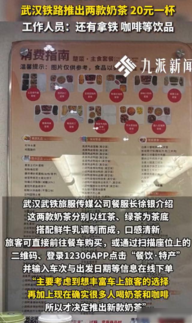 近日,中国铁路武汉局集团有限公司在管内动车组列车上推出了两款奶茶,引起广泛关注。据了解,这两款奶茶名为“云涧茉莉奶白”和“浮生红颜”,由武汉武铁旅服传媒有限责任公司携手武汉本土知名奶茶品牌联合打造,并于今年6月正式上线销售。单杯售价20元,推出以来受到各地旅客的欢迎。“主要考虑到想丰富车上旅客的选择,再加上现在确实很多人喝奶茶和咖啡,所以才决定推出新款奶茶。”武汉武铁旅服传媒公司工作人员张倩表示,奶茶推出后,大部分乘客都认为和外面喝到的奶茶味道差不多。
