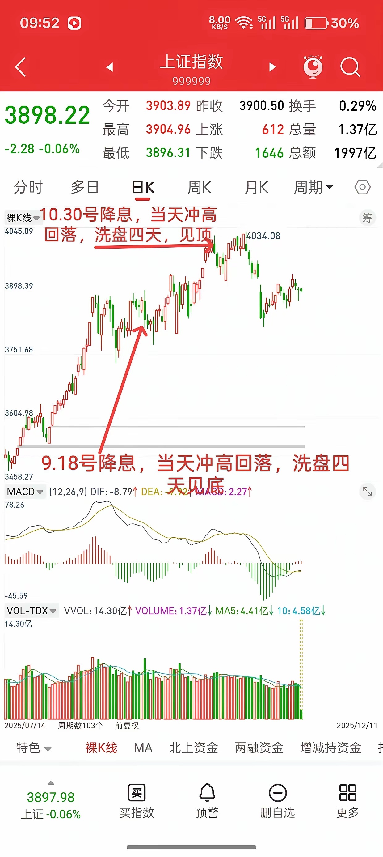 A股,重磅会议第一天,历史是否会惊人的相似!先说观点,9.18号美联储降息,A股当天冲高回落,上午十点半前见高点3899,随后洗盘四天,见底3774,然后,开启新一波反弹。10.30号美联储降息,A股当天冲高回落,也是上午十点半左右见高点4025,随后洗盘四天,见底3922,然后,开启新一波反弹。降息是利好股市,但是,大部分情况是先冲高,再砸盘,砸出一个黄金坑,而降息前就是,拉高,让踏空的人感觉错过好多机会,殊不知,利好落地,大资金兑现。行情会不会复制前面走势,没人知道,但是,做好预期,以及应对方案即可。