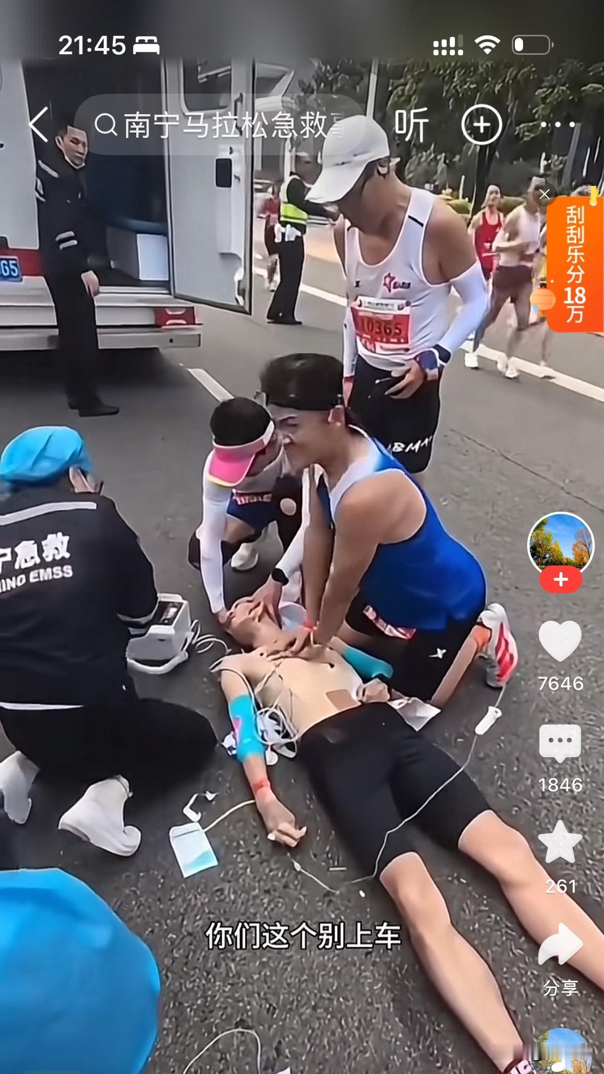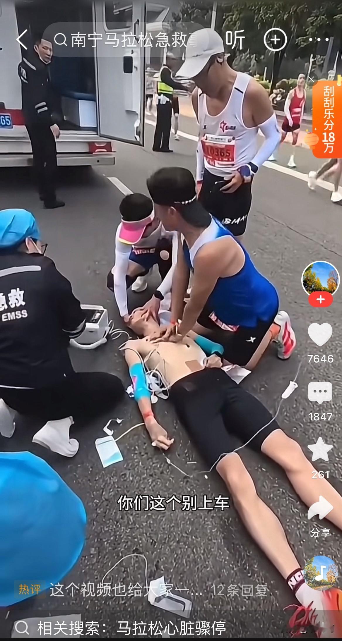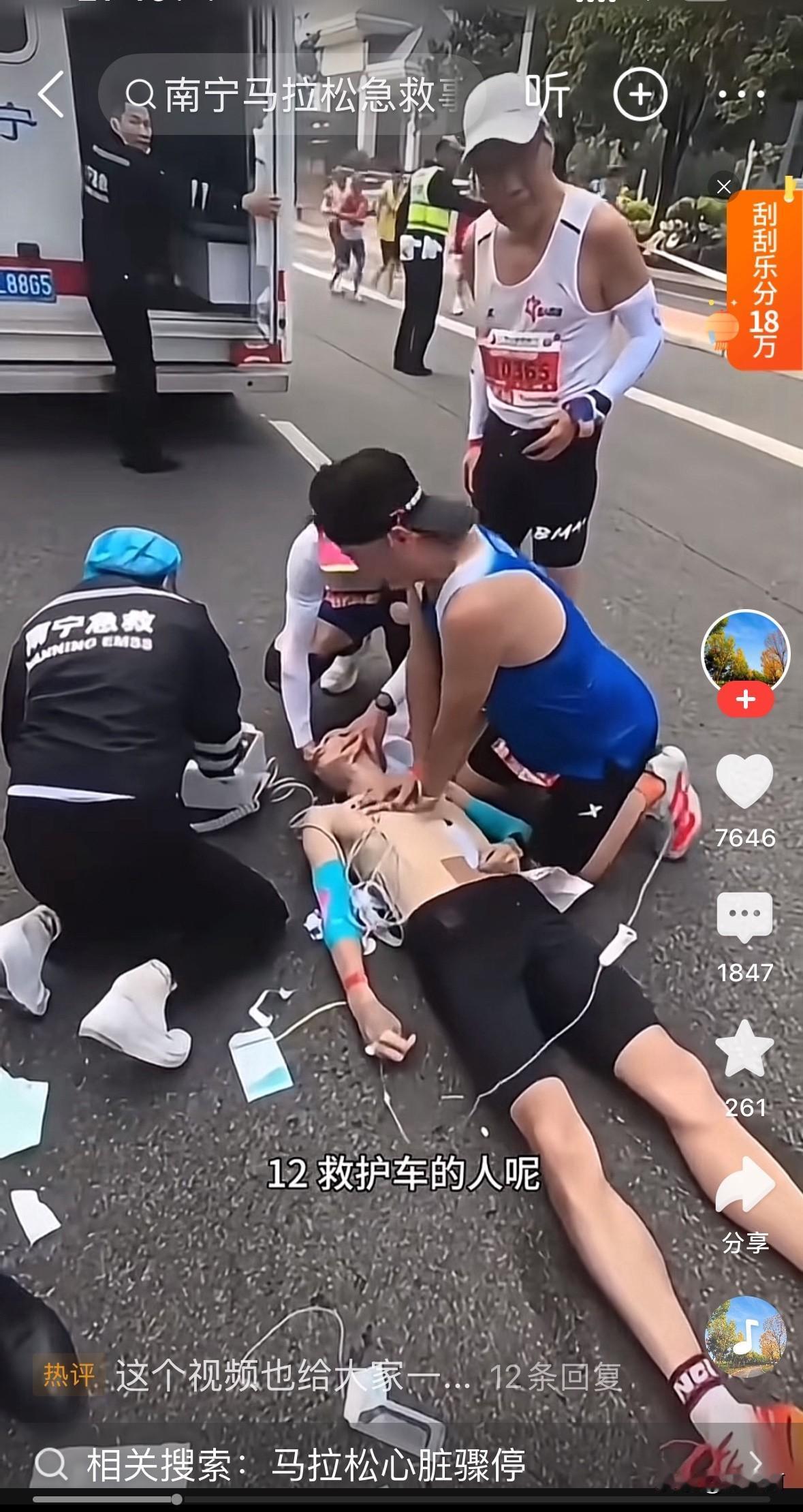 南宁马拉松跑友心脏骤停,跑友刘刘先生急救成功,比医生还专业! 12月7日,南宁马拉松约41公里处,一个参赛选手突然心脏骤停,倒在了跑道上。最终在参赛选手刘先生和现场其它选手及医护人员的抢救下,平安无事。 心脏骤停的黄金抢救时间紧急,超过4分钟人可能就救不过来了。 值得庆幸的是君乐宝跑团的刘先生学过急救知识,他刚刚跑到这里发现了危险,马上停下来对患者实施心肺复苏。他一边对患者进行心肺复苏,一边指挥现场的急救医生用AED对患者进行电击,比急救医生都专业。 而急救医生的现场表现却太出乎意料,在刘先生对患者进行心脏按压时没有医生去帮助他,甚至在使用AED时医生位置都没有找准。 当患者还没有苏醒时,急救医生就准备把患者拉到车上,被刘先生喊住:先别上车,现场急救!全程医生好像给人的感觉就是不会急救! 网友说,这个急救车配的医生难道是充数的? 当马拉松这种运动量超大的跑步成为全民运动,举办这种赛事的时候,是否需要提高公众的急救能力,更加完善组织方的急救能力? 取材网络,侵删