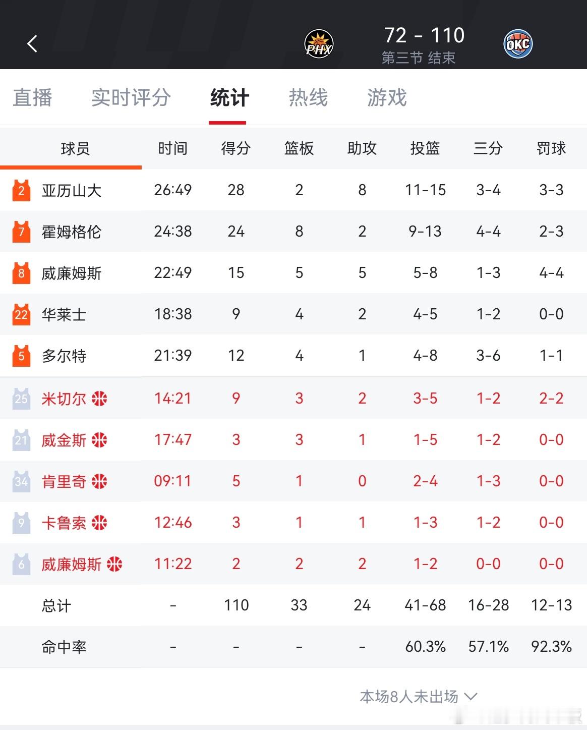 三节结束雷霆领先太阳38分,全队命中率60.3%!可以坐等马刺和湖人的胜者了太阳vs雷霆