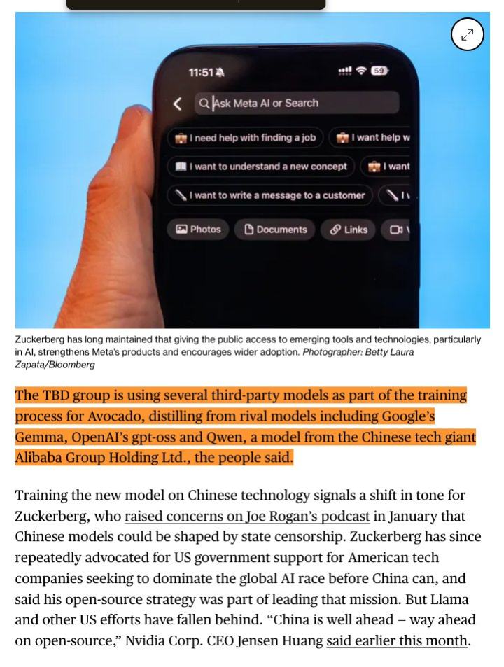 12月10日晚间消息,据彭博社报道,美国科技巨头Meta在训练其代号为“牛油果”的新模型时,使用了阿里巴巴Qwen模型进行蒸馏优化。
