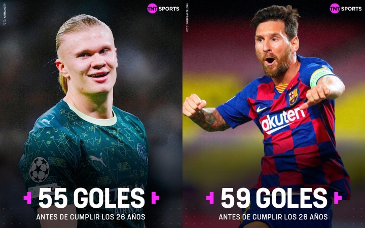 据统计,25岁的哈兰德在欧冠已打进55球,26岁前欧冠进球数仅次于梅西(59球),而哈兰德明年7月21日才满26岁。
