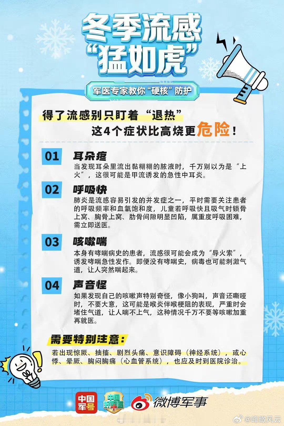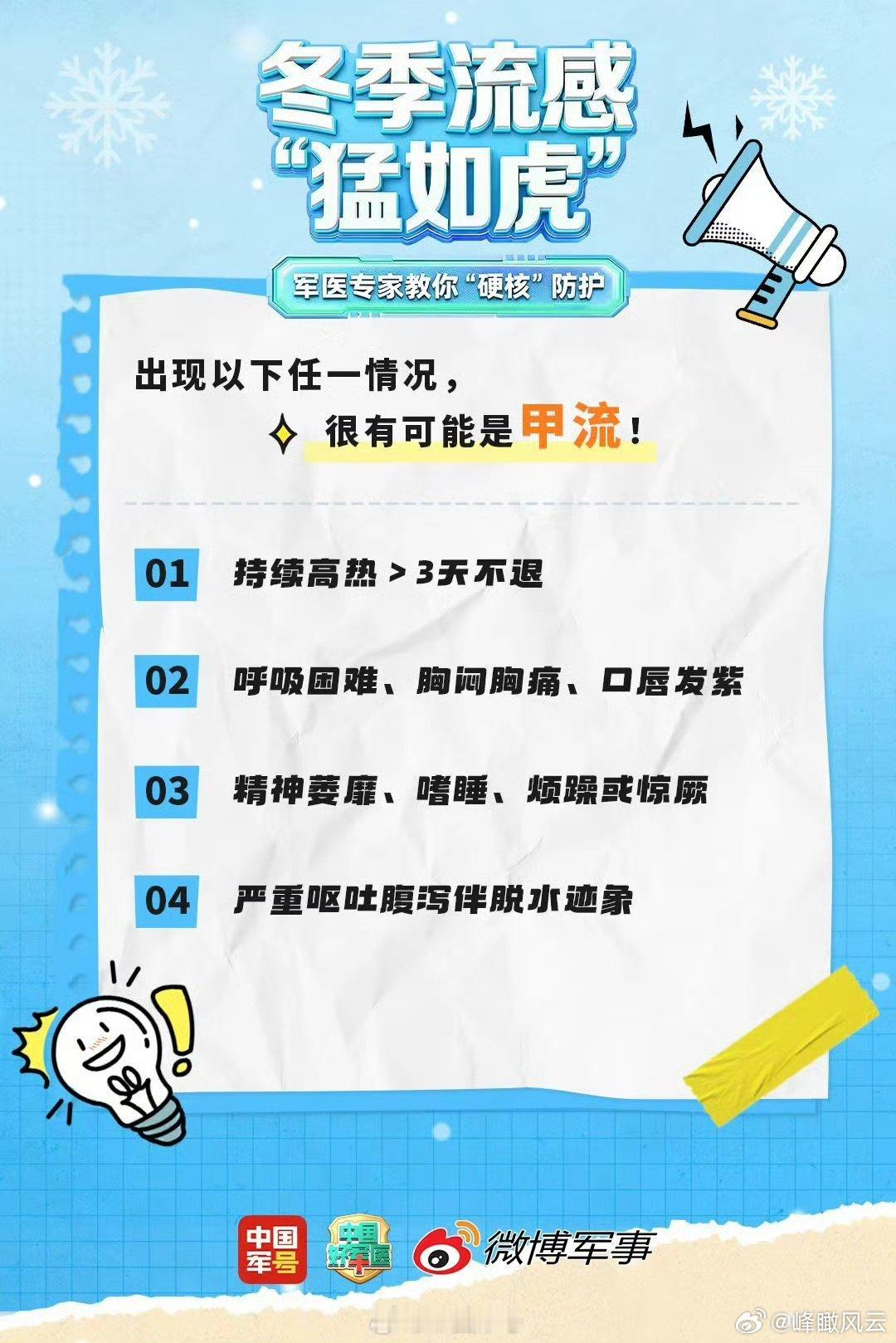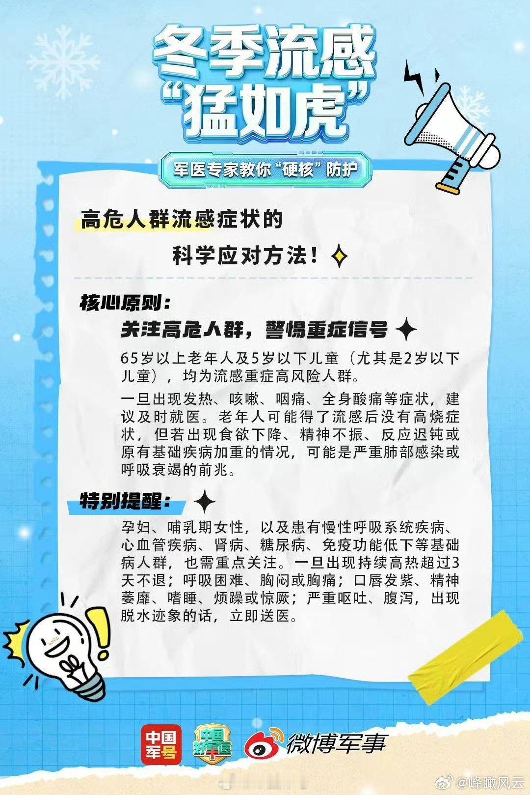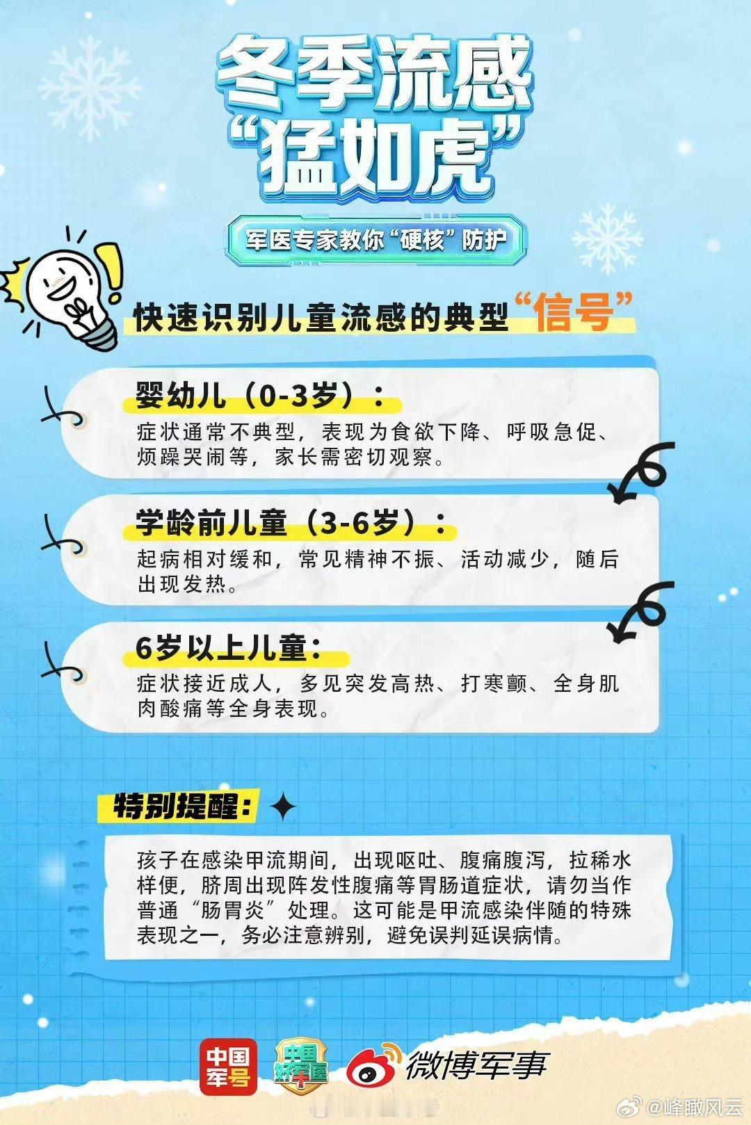 【转发收藏!军医教你防治流感】降温季流感高发,为啥孩子总是中招?高危人群该怎么应对?军医专家教你硬核防护!还有快速识别儿童流感的典型信号,家长们赶紧码住!戳图查看↓↓ !(