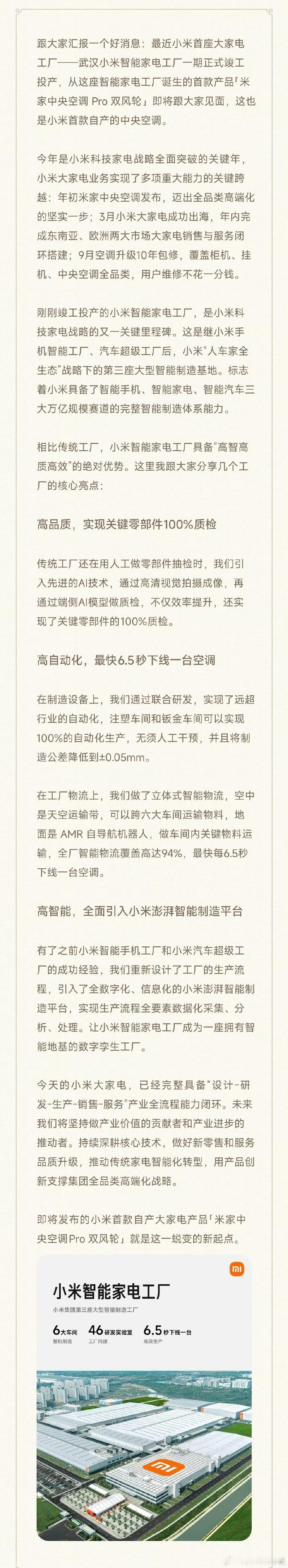 卢伟冰宣布小米将发布自产中央空调小米大家电又放大招!卢伟冰官宣首款自产中央空调来袭,武汉智能家电工厂直出,直接对标高端品牌!线上市占率已冲进前三的小米,这次剑指高端中央空调市场,怕是要让行业格局再次洗牌,你会冲小米自产中央空调吗?