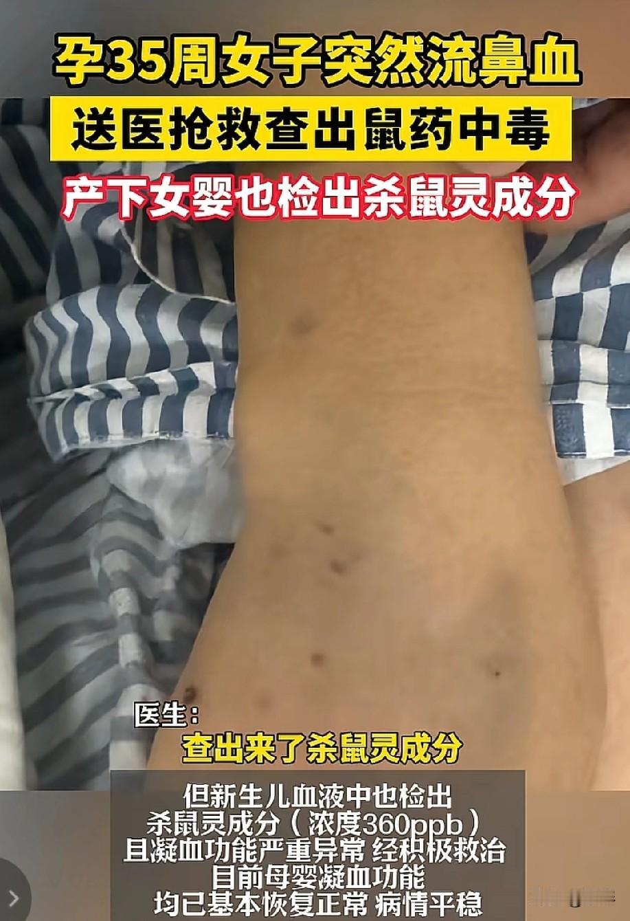 35周孕妇血液查出耗子药,谁在给孕妇和胎儿下毒? 广东深圳一名怀孕35周的邓女士,突然出现左侧鼻腔出血、尿道刺痛、口腔黏膜糜烂的症状,还伴有低热,被紧急送医后,竟查出是抗凝血类鼠药中毒。 经过抢救,邓女士顺利剖宫产下一名女婴,可令人揪心的是,新生儿的血液里也检出了杀鼠灵成分,浓度达到360ppb,凝血功能更是严重异常。 一条本应充满期待的生命孕育之路,突然被鼠药中毒的阴影笼罩,母婴二人双双陷入危险。好好的孕妇,为何会摄入鼠药? 是误食了被污染的食物,还是有人蓄意为之?这背后的真相,实在让人不寒而栗。 目前母女二人经积极救治,凝血功能已基本恢复正常,病情平稳,但“投毒”的疑云仍未散去。 究竟是意外还是人为,期待警方尽快调查清楚,给这对母女一个公道,也让大众揪着的心能放下。