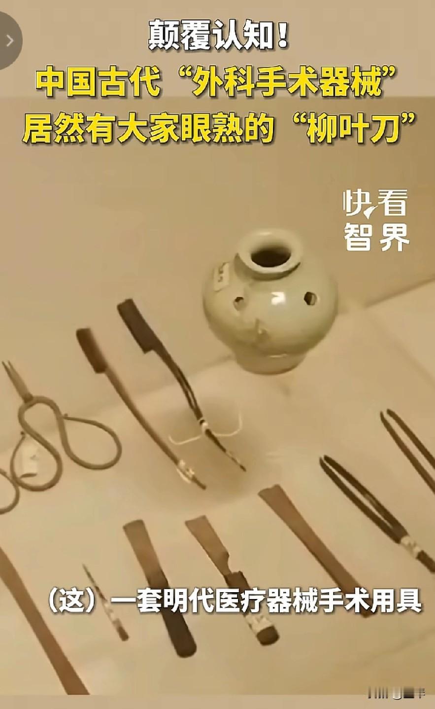 一直以为咱仿西方医术,直到见了600年前老祖宗的手术刀才知道,原来咱家早被贼偷了。 刷到江阴出土的那套明代医疗器械时,我盯着那把“柳叶刀”愣了好半天——这弧度、这形制,和现在外科手术用的手术刀居然能对上七八分。 小时候翻课本,总觉得“外科”是西方传来的词,直到看见这堆锈迹裹着的镊子、剪子、穿刺针,才反应过来:咱老祖宗600年前就拿着这套家伙事儿做手术了啊? 东汉华佗敢给关羽刮骨,唐代有专门治“金疮”的外科方,到了明代,连器械都配出了“手术工具箱”:带孔的瓷罐是消毒器,弯嘴壶是冲洗用的,那几把薄刃刀,比现在的手术刀就少个无菌包装。 后来西医传进来,有人说“咱的医术是跟人学的”,可这堆埋在土里的铁家伙偏要出来打脸:不是咱仿人家,是人家后来的技术里,早掺了咱老祖宗玩剩下的活儿。 就像这把柳叶刀,600年前它在医生手里划开伤口清创,600年后换个材质,还在干一样的事儿——只是中间那几百年,咱差点把自家的宝贝当成了“舶来品”。 中医 你认为是中医伟大还是西医伟大?