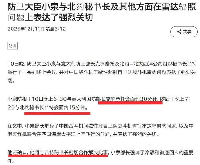 高市早苗向美国求助,还想把火烧到G7,对方却只读不回!日本防卫大臣告状到北约,最后只换来15分钟通话。看来,日本这次真的是穷途末路了! 由于高市早苗的涉台言论,我国近期一些列举措让日本措手不及。现在为了尽快摆脱被动局面。12月10日高市早苗在日本众议院会议表示希望赴美国和特朗普进行面对面的沟通,再不济,找个第三方和美国总统特朗普沟通也行。 她还向G7各国首脑提供相关信息并争取支持。但是截至到目前为止,没有一个国家对于高市早苗的请求给了正面回复,对方都是只读不回。 另外一头,日本的防卫大臣小泉进次郎把我们歼十五战机雷达照射F-15的事情捅到了北约,还马不停蹄的主动给北约秘书长吕特通电话,汇报当时的情况,结果15分钟对方就挂了电话,因为对方心知肚明,北约现在为俄乌冲突的事情焦头烂额,可不想趟日本这趟浑水。 如今看来,日本有错在先,却还想着争取别人的支持,最终只能沦落为孤家寡人。