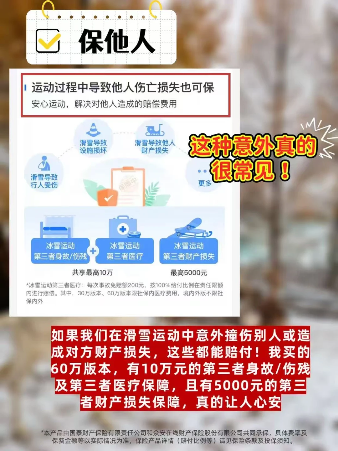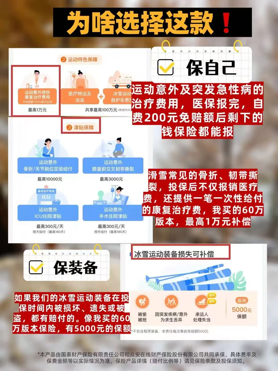 👍针对滑雪常见的骨折、韧带撕裂除了医疗保障,还会有一笔“额外津贴”,我买的60万版本,最高补偿1万元!