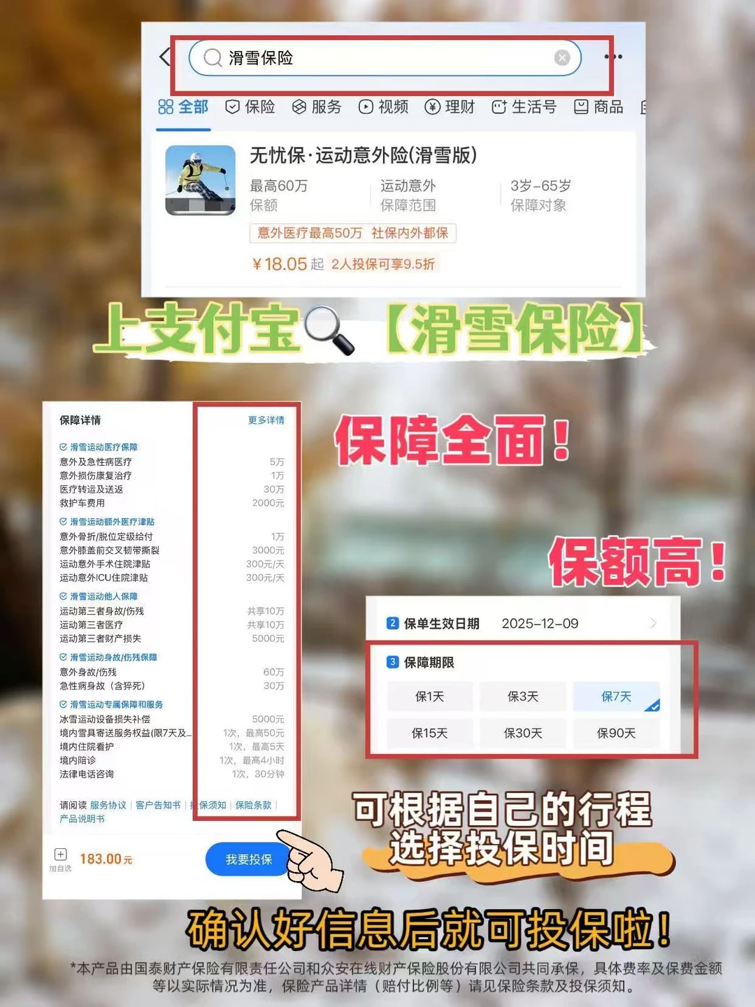 想买这个滑雪险可以上支付宝搜【滑雪保险】,几分钟就能购置好~