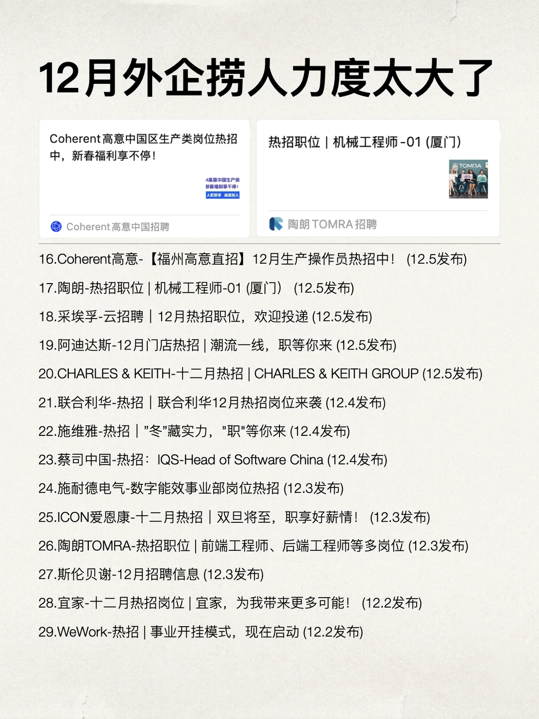 12 月真的很适合去投外企,刚把最新一波机会整理了一遍,就是那种都在疯狂补人的状态。年底这个招人速度,一眼就能看出来:是真的急、是真的刚需、是真的机会非常多。
