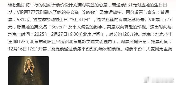 谭松韵生日见面会票价谭松韵北京见面会票价谭松韵北京见面会票价:普通票531是谭松韵的生日,VIP票777是谭松韵的英文名“seven”及幸运数字,双向奔赴的一场约会,这个女人太会了,12月27日期待见面