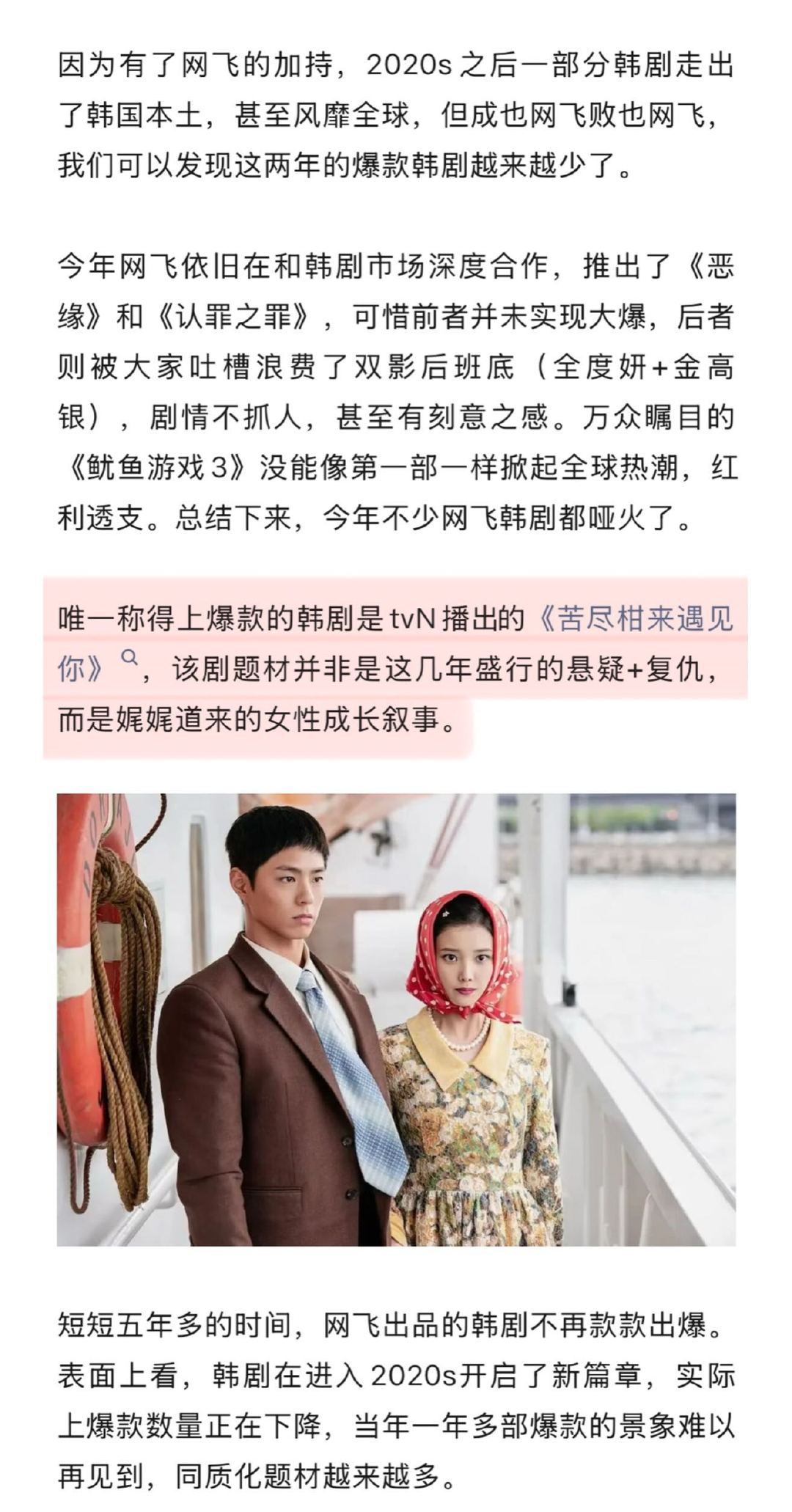 爆款韩剧背后的影视寒冬为什么今年的爆款韩剧变少了 从前是小而美的爱情叙事,后来满屏都是复仇爽感,《鱿鱼游戏1》让韩剧冲出国门,却也把题材逼进了死胡同。2025年网飞多部剧失灵,而《苦尽柑来遇见你》凭娓娓道来的成长故事突围。