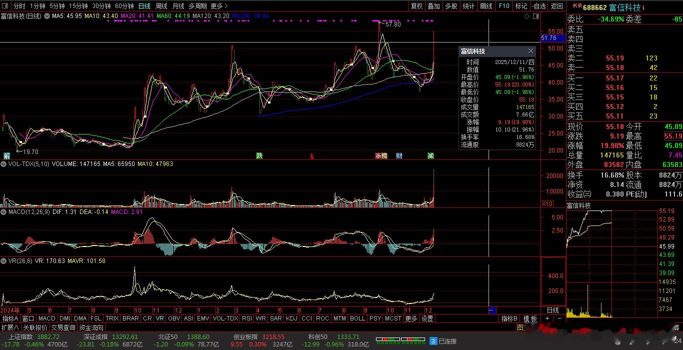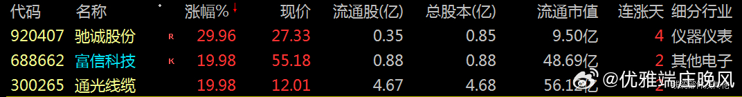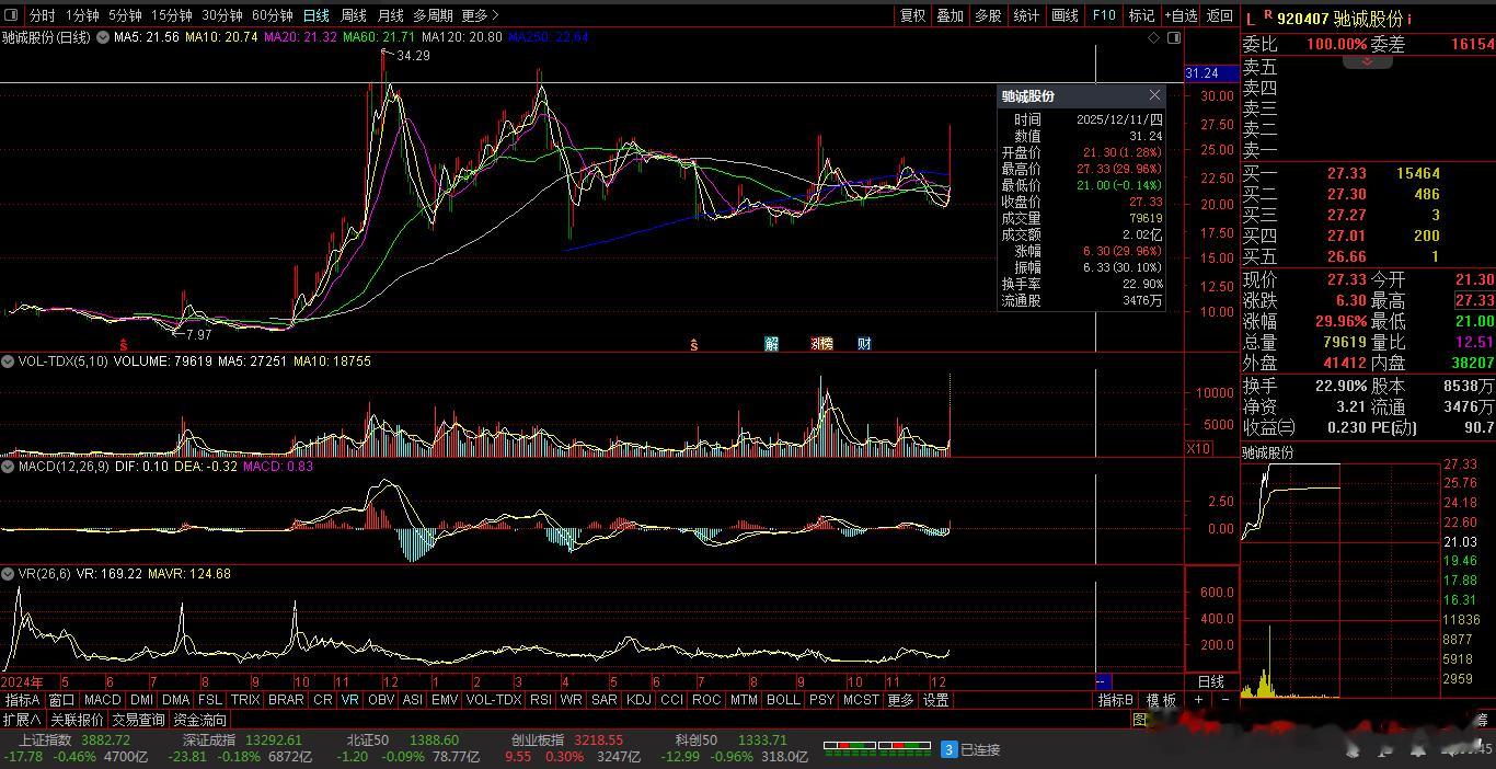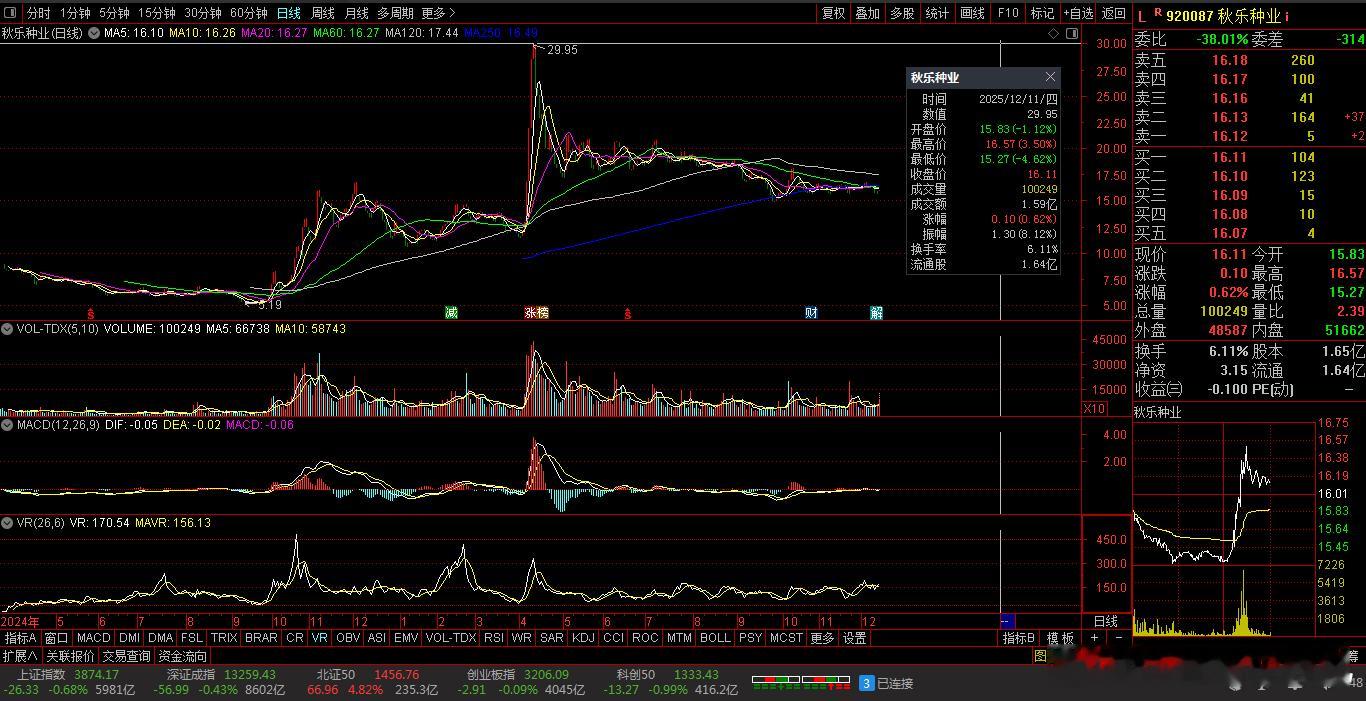 【财富晚茶】午盘透析(12.11):北证跌0.09%:航天反弹体育回调导语:作者系《网易号》优质财经领域创作者。曾经原创作者和知名网易号旅游领域创作者。大跨度行业等的写作,颇受网友喜爱。作品发表于2025.12.11.12:18 优雅端庄晚风。【内容概述】今日股市午评:截止11:30:沪指:贡献1根阳线3阴线。深指:贡献2根阳线2阴线。沪指跌破:阻力位:03906点。沪指突破:支撑位:03876点。深指突破:阻力位:13344点。深指突破:支撑位:13126点。追寻盘面:沪深强势冲高兑现,尾盘恐慌再度杀跌。一、透析市场:风口公司,上下起伏920087 秋乐种业 盘中02涨1、突破四年箱顶视野盘面:前期五顶:杀跌到位。2025-12-11 截至11:30 股价报收:16.118元。该股上涨:0.62%。成交总量:100296手,成交金额:1.59亿元。总换手率6.11%,观总市值:26.38亿元。流通市值:26.38亿元。2、玉米花生翘楚主营业务:玉米小麦、花生大豆芝麻等农作物种子的产和销售。公司品牌:农业产业化国家重点龙头。3、营收净利递减财报透视:2025-09-30 三季度报:公司营收:1.4991亿 同比增-8.31%。公司净利:-1613.7747万 同比增-275.12%。二、沪深绿盘:空方强势,悲剧股市今天目击:沪深北市:早盘:高开一跌,二涨五跌。尾盘:一涨一跌,最低绿盘。看点之一:沪深北指:沪指高开:盘中弱势,震荡下探。看点之二:创指强势:逆市上扬。看点之三:沪深北市:半日成交:11651亿元。盘面追踪:4242股飘绿。三、沪深阴棒:个股弱势,亏钱效应沪深追踪:截至午间:市场收盘:沪指跌0.46%报3882.72点,深指跌0.18%,创指涨0.30%,北证50指跌0.09%,沪深北市:11651亿元。四、盘面观察:航天脉冲,体育回调1、板块扫描透析沪深板块:板块走强:航天、银行等。板块走低:体育、零售、地产、食品饮料、农业、酿酒等。概念活跃:特高压、商业航天、可控核聚变等。2、个股涨跌起伏沪深北市:多空遭遇。1107上涨,42个股涨停板。4242股下跌,11跌停板。沪深北市:合计成交:11651亿元。午盘视野:沪深高开做多夭折,尾盘恐慌再次杀跌。五、沪深涨跌:三甲前茅,安不忘危1、今日涨幅谁家主旋律:天经地义:风口股票涨停板920407 驰诚股份 688662 富信科技 300265 通光线缆第一、涨幅榜眼排行榜-1:920407 驰诚股份主营业务:气体环境安全监测产品研产和销售。公司品牌:气体安全监测领域高知名度和头部企业。排行榜-2:688662 富信科技 主营业务:半导体热电器件研产和销售。公司品牌:世界领先半导体热电技术解决方案及应用产品提供商。排行榜-3:300265 通光线缆主营业务:光纤光缆-输电线缆-装备线缆等研产和销售。公司品牌:OPGW产品市场占有率近三年均排名第二;通信用高频电缆系列市场份前三;国内最早节能型导线生产头部企业;航空航天耐高温电缆军方产品五家国内供应商之一。第二、综评榜技术看盘-1:920407 驰诚股份。潜力股票-1:920407 驰诚股份:气体安全监测领域高知名度和头部企业。风险股票-1:暂时没有。2、今日跌幅谁家主旋律:摇摇欲坠:弱势股票涨停板300460 ST惠伦300640 德艺文创301486 致尚科技跌幅榜-1:300460 ST惠伦主营业务:石英晶体元器件(简称“晶振”)研产和销售。公司品牌:全球先进“频率控制与选择”压电石英晶体元器件供应商。跌幅榜-2:300640 德艺文创主营业务:海内外客户提供研发设计-外包生产-全球化销售一站式服务文创家居用品整体供应商等研产和销售。公司品牌:国内文创家居领域第一股。跌幅榜-3:301486 致尚科技主营业务:精密电子零部件等研产和销售。公司品牌:国际竞争力的电子零部件生产商和技术服务商。六、创作不易:优质网易,财经作者投资投机迷茫之中:给予尽可能有帮助:资本市场风险自负。(优雅端庄晚风《网易号》财经领域创作者和原创作者 违者必究)