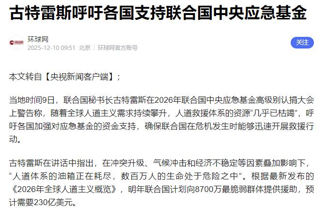 古特雷斯又来要钱了!一个多月前,中国刚补缴6亿8573万美元会费,而美国还欠着30亿美元!   12月9日,联合国秘书长古特雷斯在一场认捐大会上急了,直言:全球人道救援体系的资源快耗光了,各国快给中央应急基金多掏钱。   非洲的南苏丹今年祸不单行,洪水把大片土地泡成沼泽,10万人没了家,霍乱疫情还在旁边虎视眈眈。   联合国难民署本来计划帮40万人,结果手里没钱,现在只能顾上三分之一,那些被洪水淹了70%的区域,救援物资说砍就砍。   黎巴嫩那边更悬,联合国维和部队因为经费不够,要裁掉四分之一的人,明年初就得撤完。   这些“蓝盔”守着以黎边境的“蓝线”,他们一走,本就动荡的地方指不定要闹出多大乱子,老百姓又得背着行李逃难。   连联合国自己都快扛不住了,18.8%的员工丢了工作,儿童救助、人权保障这些核心活儿都得缩水,说这是联合国的危机,不如说是某些国家搞出来的全球麻烦。   谁都没想到,能救急的钱,偏偏被最大的缴费户给卡住了。说的就是美国这个全球第一大经济体,占着联合国22%的预算份额,本该是最靠谱的“金主”,结果成了最能赖账的“老赖”。   到现在,常规预算欠了15亿,加上维和经费和法庭摊款,总欠款早超30亿了。   这钱可不是小数目,够联合国常规预算撑大半年,要是能到账,中央应急基金也不至于紧巴巴的,巴基斯坦洪灾、土耳其地震时,救援物资也能更及时地送过去。   美国真的掏不出这30亿吗?它每年军费都快摸到9000亿美元的门槛,造一艘福特级航母就得砸130多亿,怎么偏偏联合国的会费就成了负担?   明眼人都清楚,这根本不是钱的问题,是态度问题。   对比之下,咱中国的做法才叫大国担当。这些年经济上去了,该扛的责任从来没含糊过。   2025年联合国常规预算里,咱的分摊比例升到了20.004%,对应6.8573亿美元的会费,前阵子因为支付流程延迟,连本带利全补清了。   要知道,以前咱的会费份额才1%,排第十名,现在冲到第二,背后是国力的提升,更是对国际责任的敬畏。   咱中国不光缴清自己的份儿,还总想着多帮衬一把。2024年给联合国粮农组织捐了1.2亿美元,其中一部分就用在了非洲佛得角的农业合作上。   另外,咱还给联合国应急基金捐了5000万,这些钱不是冰冷的数字,是巴基斯坦洪灾里的救援粮,是土耳其地震中的临时帐篷,难怪非洲朋友说,中国的钱是真能救命的水和粮。   古特雷斯想筹款没问题,但得先把账算清楚,别光盯着守信用的国家薅羊毛。联合国是193个国家的共同平台,不是美国的后花园,凭啥它想赖就赖?   咱中国负责任,但不是冤大头,美国欠的账必须还,这不仅是钱的问题,更是维护国际公平正义的底线。