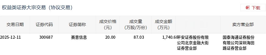 12月11日,赛意信息大宗交易成交87.03万股,成交额1740.6万元,占当日总成交额的13.74%,成交价20元,较市场收盘价22.12元折价9.58%。