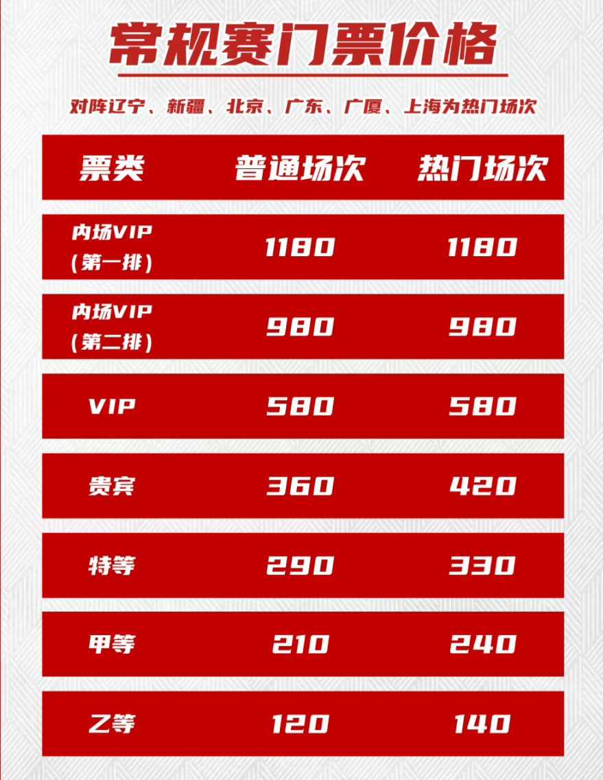今日,山西男篮公布单场票价:普通场次120-1180&热门场次140-1180。