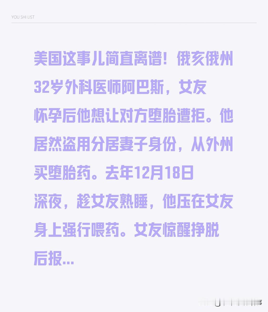 美国这事太离谱!俄亥俄州32岁外科医师阿巴斯,女友怀孕后他想让其堕胎遭拒。竟盗用分居妻子身份从外州买堕胎药。去年12月18日深夜,趁女友熟睡,他压身强喂药。女友惊醒挣脱报警,还被他强行挂断。女友急诊后孩子没保住。 女友起初以为怀孕是喜讯,阿巴斯却大吼,还承认没离婚。他称女友同意服药,谁会信?俄亥俄州医学委员会吊销其执照,他被控6项罪名。这医生缺医德,用医学知识害人,必严惩!