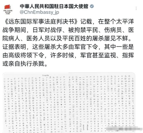 再次刊出铁证!日本不认错,我们把日本军国主义的恶行,继续暴露在阳光之下!12月11日,中国驻日本大使馆拿出日本文件写到,《远东国际军事法庭判决书》记载,在整个太平洋战争期间,日军对战俘、被拘禁平民、伤病员、医院病人、医务人员以及平民百姓的屠杀屡见不鲜。 证据表明,这些屠杀大多由军官下令,其中一些是由高级将领下令,许多时候,军官甚至监视、指挥或亲自执行杀戮。很显然,在日本军国主义抬头的今天,我们再次拿出铁证,这就是告诉日本,告诉日本社会,日本当年发动侵略战争,都干了什么样惨无人道的勾当。 这份判决书可不是随便写的材料,它历经近两年零七个月的审理才最终成型,法庭前后开庭818次,收录的文件证据就有4000多件,光判决书原文就长达1213页。这些内容都是同盟国通过实地调查、证人出庭、战犯口供等多种方式核实的,每一个字都藏着血淋淋的真相。 日军的暴行根本不是零散的个别行为,他们在占领区域内,把屠杀当成了常态操作。在南京,日军占领后制造了震惊世界的大屠杀。华中方面军司令官松井石根曾下令,让部队分区对城内进行扫荡。这场屠杀里,被杀的中国民众就达20万人以上,还有很多尸体被焚烧、投入长江,这些都没算在其中。 不止中国战场,太平洋地区的多国人民也遭了日军的毒手。他们在马来亚的亚历山大医院、泰国的琼蓬角、荷属东印度的望涯群岛等100多个地方,都实施了大规模屠杀。日军常常把妇女强奸后,再把汽油浇在她们头上点火焚烧。这种毫无底线的恶行,连基本的人性都荡然无存。 更让人愤怒的是,这些恶行都有明确的指挥链条。不少高级将领直接下令动手,基层军官则现场监督执行。日本战犯藤田茂的笔供就记录,他曾对下属军官全体教育,说为了让士兵习惯战场,杀人是最快的方法,用俘虏来试胆效果最好,还强调刺杀比枪杀更有效果。 藤田茂自己也亲手犯下诸多罪行,1939年4月,他命令第1中队长,让部下的9名士兵刺杀了9名俘虏。1944年4月,他在归德旅团司令部召集各队长,直接授予联队长使用瓦斯弹的权限,还明确要求俘虏尽量在战场杀害,算入作战战果。1945年3月,他又下令在一个约50户的村庄,把包括老人、妇女、小孩在内的村民全部屠杀。 但那些身居高位的战犯,战后还百般抵赖。东条英机作为日本法西斯魁首,竟然在口供书里称日本的侵略是自卫行动,完全否认侵略满洲的事实。松井石根面对南京大屠杀的指控,谎称自己当时卧病苏州,根本不知道有大规模屠杀的情况。 可证据不会说谎。中国检察官当时收集的证人证词和其他证据,堆起来有一尺多高。南京大屠杀的幸存者尚德义、伍长德,还有美籍医生罗伯特·威尔逊、约翰·梅奇牧师等目击者,都亲自走上法庭作证,把日军的暴行一一讲给全世界听。最终,远东国际军事法庭判处东条英机、松井石根等7名甲级战犯绞刑,16人被判处无期徒刑。 退一步说,就算有东京审判的明确结果,日本有些势力还是不愿认错。他们不仅否认远东国际军事法庭的审判结果,还频频参拜供奉着甲级战犯的靖国神社,甚至修改教科书,试图抹去当年的侵略历史。近期还有右翼势力公开叫嚣,说南京大屠杀是编造的谎言。 我们这次再次拿出《远东国际军事法庭判决书》这份铁证,不是为了延续仇恨。我们是想让日本社会看清,当年的日本军国主义到底做了什么。我们更想提醒那些试图歪曲历史的人,历史真相不会因为他们的否认就消失。 亚洲各国人民都经历过日本军国主义带来的灾难,马尼拉惨案中,一个月内就有约10万名菲律宾平民丧生。新加坡大屠杀导致数以万计的本地人遇害。这些史实都有确凿证据支撑,容不得半点篡改。 日本只有真正正视历史,承认自己当年的罪行,才能获得亚洲邻国的信任。如果一直抱着侥幸心理,放任军国主义抬头,最终只会再次伤害他人,也伤害自己。中国驻日使馆这次刊出铁证,就是要让所有爱好和平的人都警惕起来,不让历史的悲剧重演。 我们不会让无数先烈的鲜血白流,更不会让受害民众的冤屈被遗忘。只要日本一天不彻底认错,我们就会一直把这些铁证摆出来,让日本军国主义的恶行永远暴露在阳光之下,让全世界都看清他们的真面目。