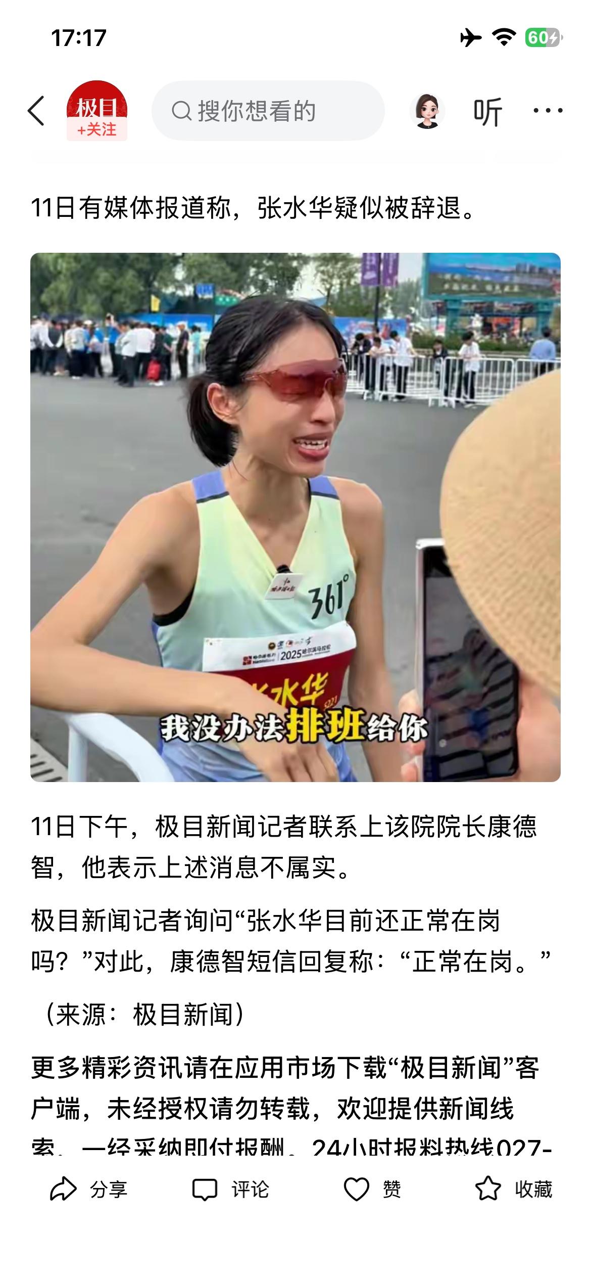 网传张水华疑似再被辞退,现单位领导短信辟谣:“不属实,正常在岗”。没记错的话,这是张水华第2次被传“辞退”,第1次是9月份的调岗。 “疑似辞退”的传言太荒谬,张水华虽然刚被处分,但只要自己不离职,单位仍很难“辞退”她。回顾张水华从“香饽饽”到“烫手山芋”历程,路人直呼没见过,很多单位是招聘“特长员工”岗位需求的,按常理说,张水华作为特长员工,能为单位提供更大价值(商业价值之外),走到以“内部处分”的方式,很难说哪一方出现问题。 而外界不断出现的“被辞退”传言,足以说明张水华和单位出现了关系裂缝,事情本不应该发展成一场博弈,如何弥补,则将考验张水华与单位的智慧。