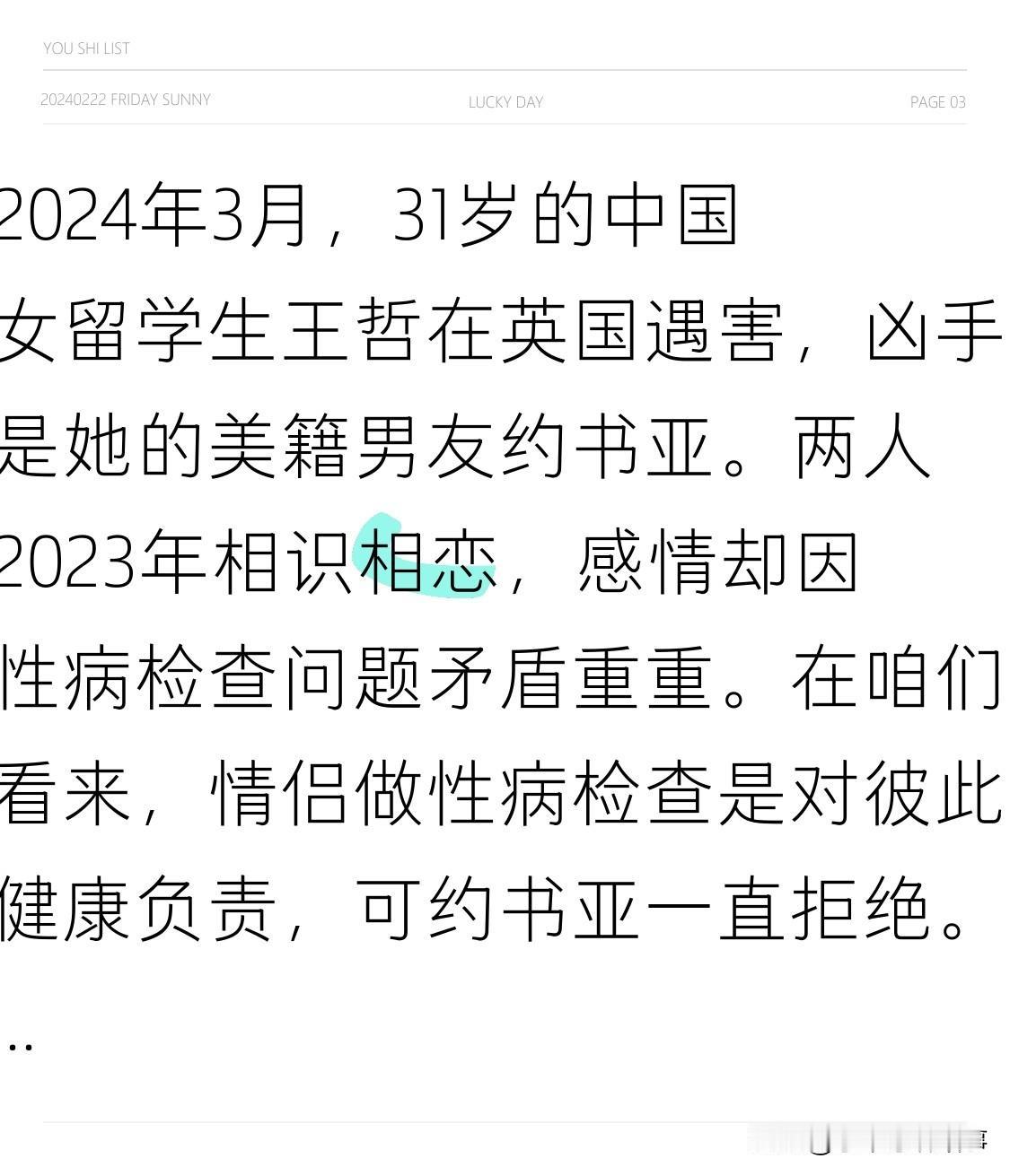 惊憾!2024年3月,31岁的中国女留学生王哲在英国遇害,凶手是她的美籍男友约书亚。两人2023年相识相恋,感情却因性病检查问题矛盾重重。在咱们看来,情侣做性病检查是对彼此健康负责,可约书亚一直拒绝。 3月的一次面谈中,约书亚失控,捅伤王哲并勒住她脖子致其死亡。作案后他还试图销毁证据、狡辩。好在当地时间12月8日,伦敦法院裁定约书亚谋杀罪名成立。约书亚抱怨王哲有洁癖才不想深交,可这更像推卸责任。一条鲜活生命消逝,这悲剧给恋爱中的人提了醒,选伴侣真得擦亮眼睛。