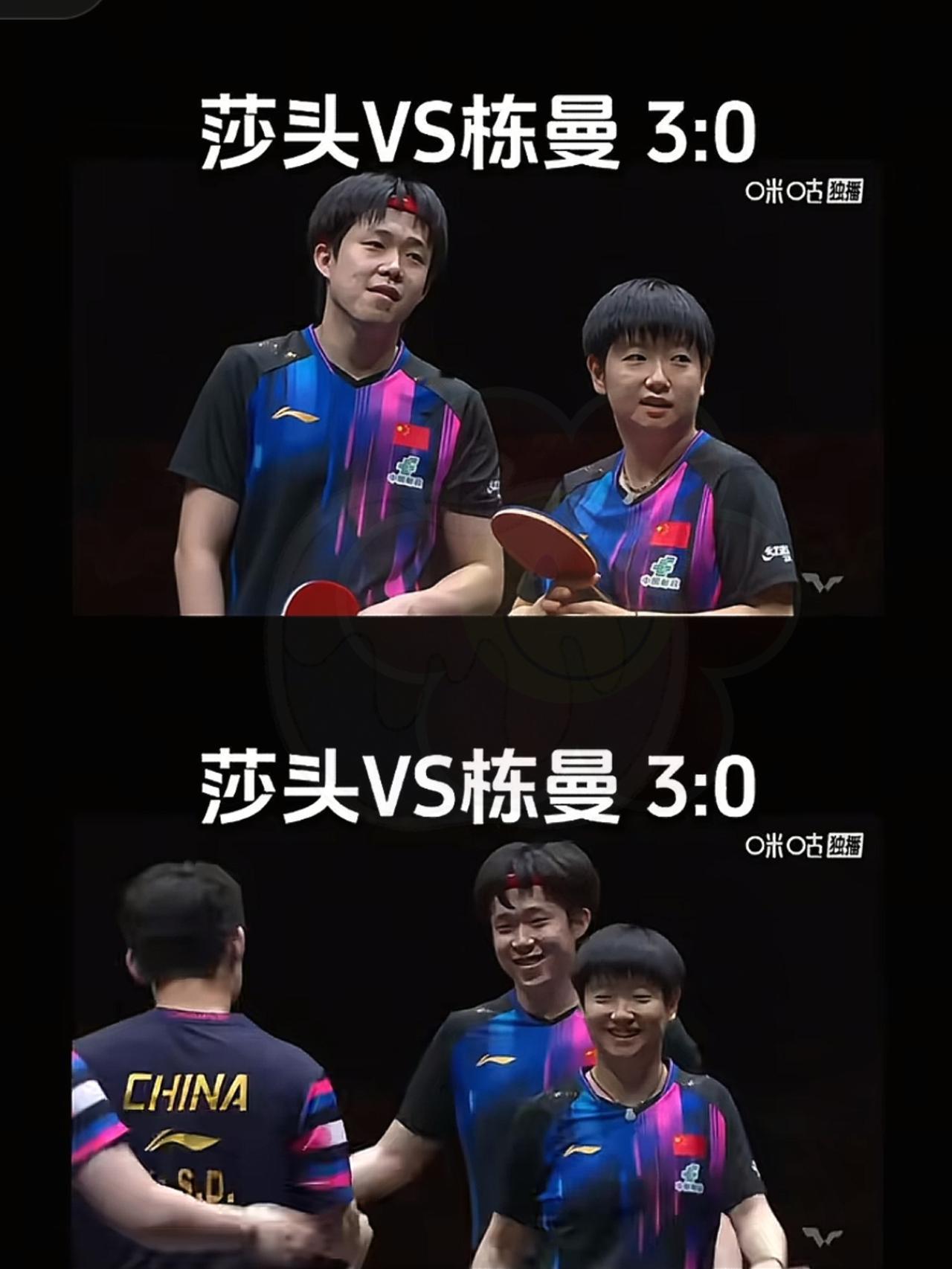 莎头对阵队友栋曼组合,打得非常激烈。但全程不到半个小时,就结束战斗啦,估计连裁判都乐开花,能早早下班咯! 第三局快结束的时候,本来比分该是10 : 6 ,裁判一不留神给判成11 : 5 ,被提醒后,那裁判手忙脚乱翻找分牌,把莎头都逗得直乐。可即便这样,也没扭转局势。栋曼组合发球,莎莎回了个触网球,比分一下成了11 : 6 ! 头哥为了给莎莎省体力,打得超猛,接发球要么强势拧拉,要么爆冲大角度得分,把蒯曼打得没了精气神! 莎头3:0横扫栋曼组合,果然姜还是老的辣,确实不太好有人能赢得了他俩! 大家觉得莎头组合这实力,还有谁能抗衡呢?