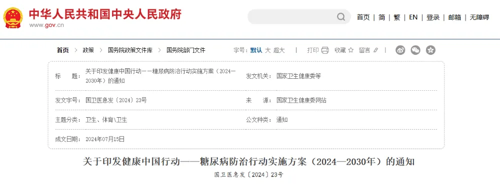 14个部委联合印发《健康中国行动—糖尿病防治行动实施方案(2024-2030年)》