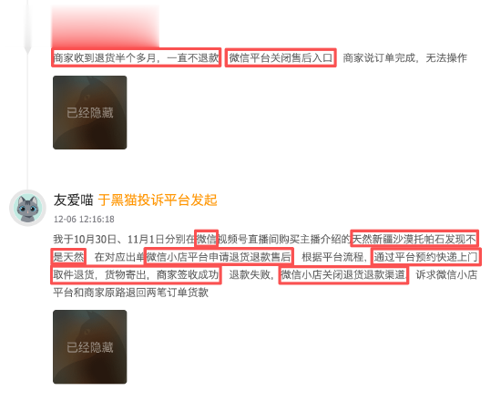 近日,有消费者向黑猫投诉反馈,自己在微信小店购买天然新疆沙漠托帕石收到后发现不是天然的,在平台申请退货退款售后,通过平台预约快递取件寄回商品,商家签收成功半个多月仍不退款,微信小店直接关闭了退款售后入口。在黑猫投诉平台上,不少消费者都遇到了在微信平台消费后平台未起到审核监管义务从而维权难的问题。截至目前,微信在黑猫投诉累计投诉量达近2.3万单,回复率仅为5.06%。