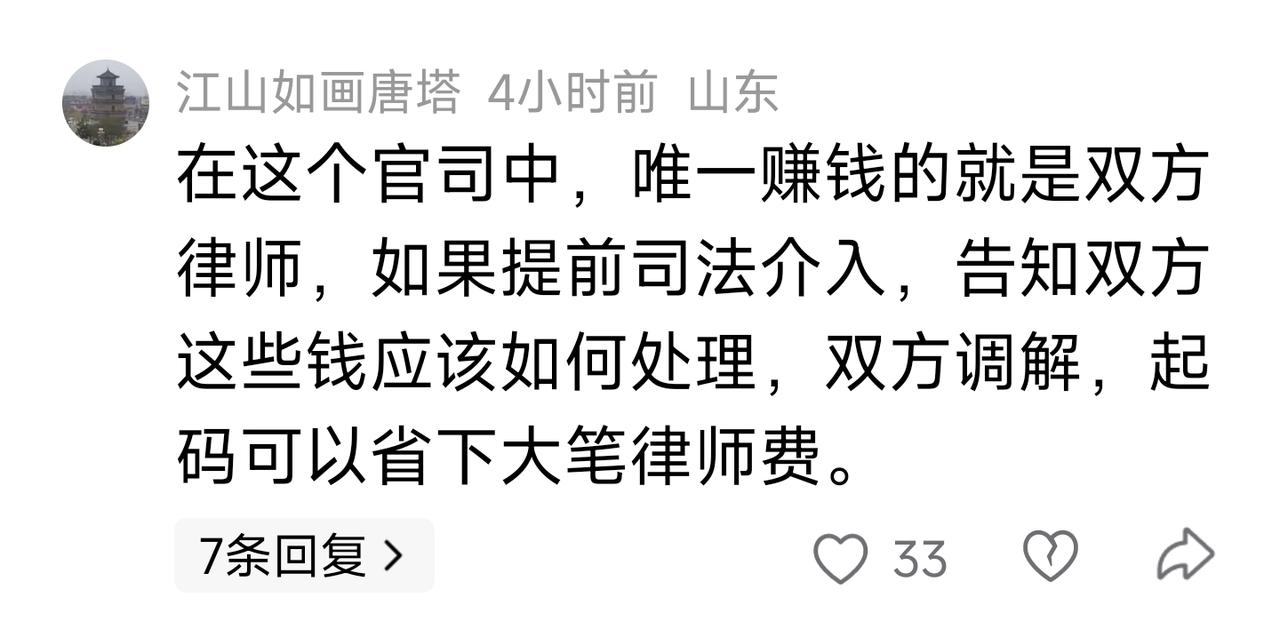 有人说:“在这个官司中,唯一赚钱的就是双方律师,如果提前司法介入,告知双方这些钱应该如何处理,双方调解,起码可以省下大笔律师费。” 打官司讲的是以事实为依据(自己身上发生的事情),以法律为准绳(对全社会公开)。为什么要请律师呢? 老师说,美国人打官司多,律师多。谁知道朝鲜的律师多不多?