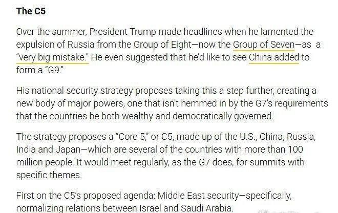最新消息: 美国正在探索组建“核心五国”的可能性 据Defense One报道,美国正在探索组建一个由中国、俄罗斯、印度和日本组成的五国联盟的可能性,以共同应对全球挑战。Defense One(国防一号)援引了近期发布的美国国家安全战略的扩展版本。 Defense One报道称:“该战略提议建立一个‘核心五国’(或称C5),成员包括美国、中国、俄罗斯、印度和日本——这五个国家的人口均超过1亿。” 预计欧盟不会参与。