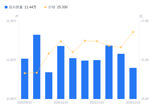 日期A股户数(户)流通A股户均持股数(股)户均持股市值(万元)2025-12-1011440020830.4252.762025-11-2811730020315.4346.682025-11-2011900020025.2146.482025-11-1011600020543.1049.122025-10-3111590020560.8349.282025-10-2011640020472.5145.532025-10-1011890020042.0547.842025-09-3011350520994.6746.192025-09-1912120019661.7237.462025-09-1011630020490.1138.89