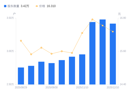 近一年(2024年12月10日至2025年12月10日),炬华科技A股股东户数从2.74万户,增加至3.42万户,增幅24.84%,区间股价上涨0.93%。