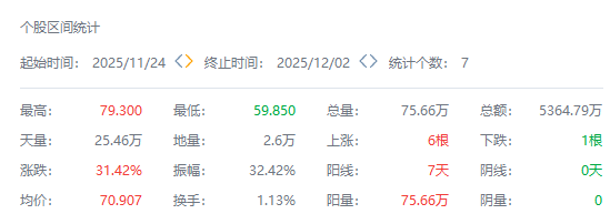 11月24日至12月2日,旺山旺水股价以一组极其罕见的“七连阳”形态,实现从59.85元至79.3元的凌厉上攻,涨幅31.42%,成功突破74元颈线。连续阳线且无阴线,表明市场多头力量取得绝对统治权。股价放量突破并站稳74元颈线,标志着双底形态的技术确认完成,上涨空间被正式打开。