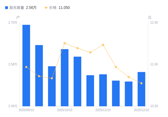日期A股户数(户)流通A股户均持股数(股)户均持股市值(万元)2025-12-102558440631.4744.902025-11-282531141069.7246.002025-11-202533641029.1946.942025-11-102551840736.5648.762025-10-312549240778.1148.082025-10-202602439944.5047.492025-10-102624239612.6747.572025-09-302574940371.1145.092025-09-192635739439.8344.252025-09-102694138584.8944.14
