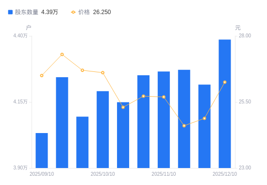 日期A股户数(户)流通A股户均持股数(股)户均持股市值(万元)2025-12-104386211900.4631.242025-11-284215912381.1730.802025-11-204271812219.1630.062025-11-104265312237.7831.442025-10-314251012278.9431.582025-10-204149112580.5131.832025-10-104191112454.4433.142025-09-304094512748.2734.042025-09-194243812299.7833.582025-09-104032412944.6034.30