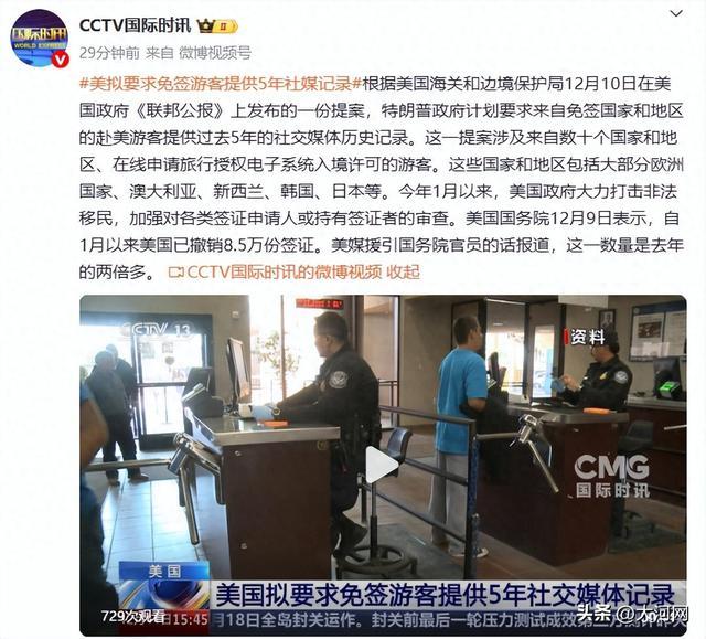 根据美国海关和边境保护局12月10日在美国政府《联邦公报》上发布的一份提案,特朗普政府计划要求来自免签国家和地区的赴美游客提供过去5年的社交媒体历史记录。