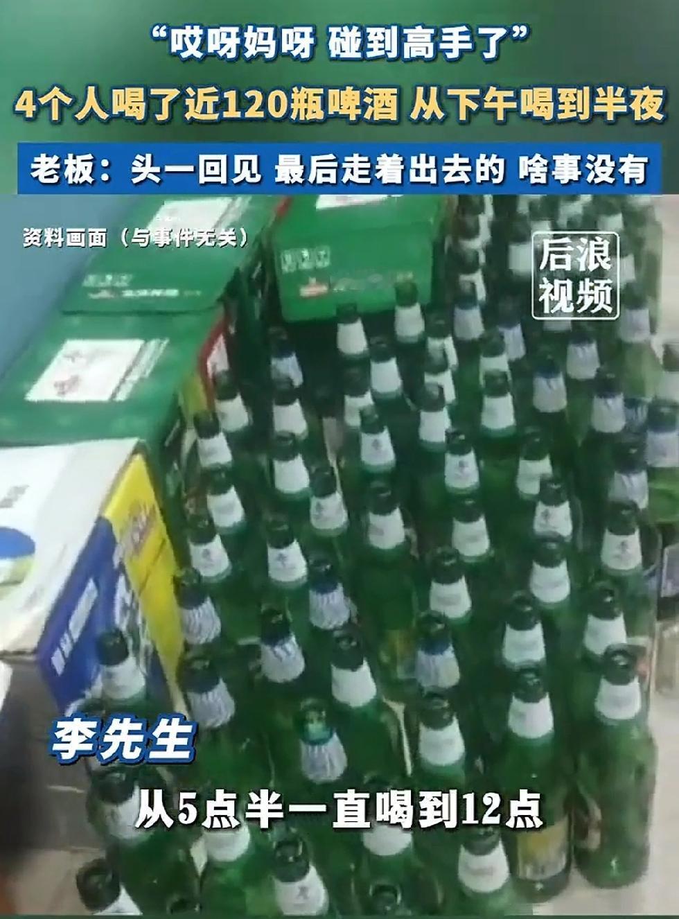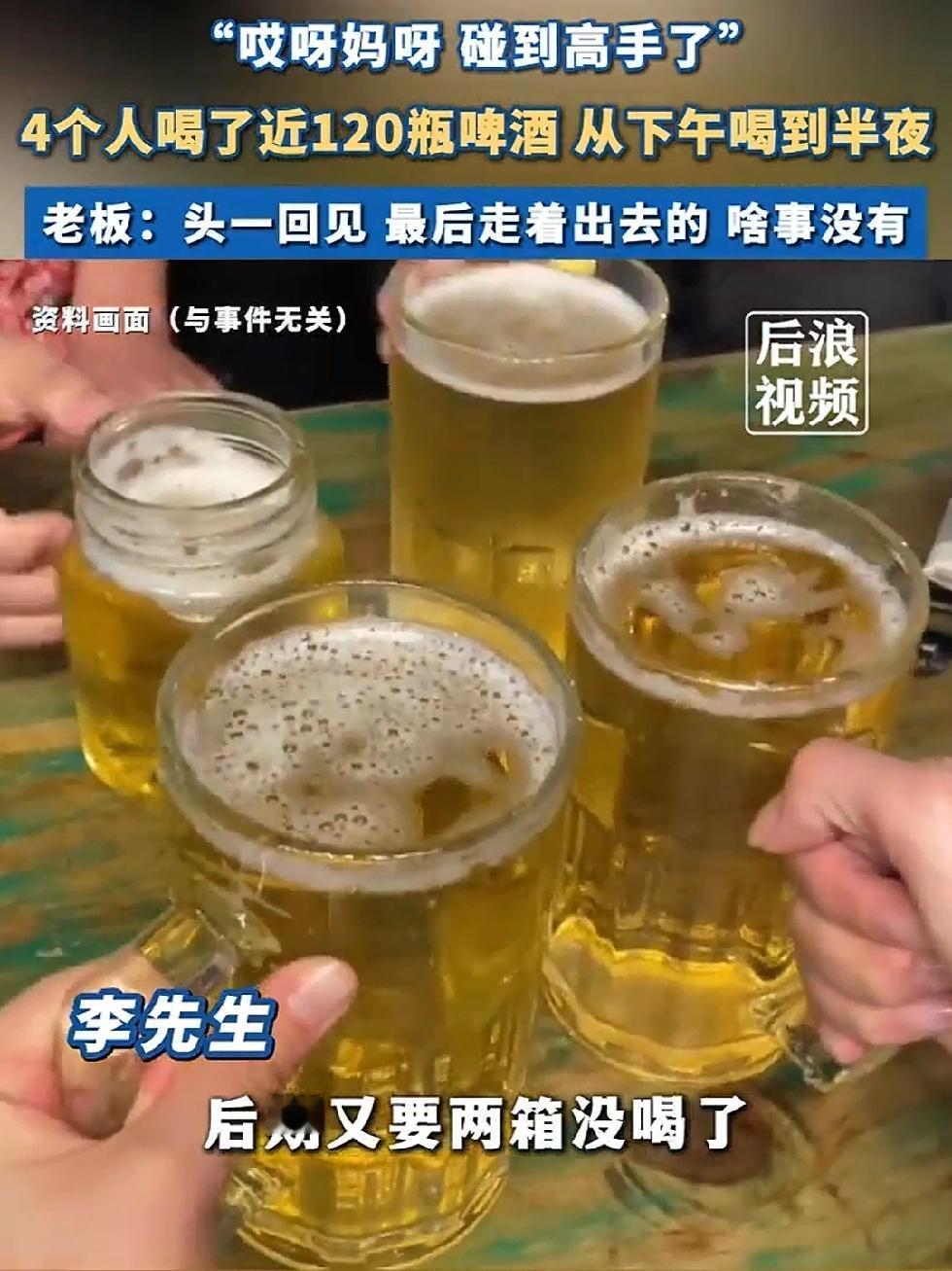 4个人,120瓶啤酒,老板有点大惊小怪了,这玩意跟水似的,一人30瓶,不多。 有能耐让他们坐着喝,别动地方,别去嘘嘘,那才牛[呲牙]憋死了也喝不了这么多。 还记得过去啤酒630ml一瓶,一箱24瓶,是塑料箱子。那时候喝酒一人坐一个啤酒箱,喝完结束。 与其说是喝酒,其实就是拉家常,喝一天,唠一天,那时候没有智能手机,主要是没有快手抖音,现在喝一天,直播一天,刷的啤酒能把酒钱刷出来[呲牙] 再也回不到过去了,过去喝酒,无忧无虑,就是哥们弟兄,或者亲兄弟姐妹之间,热热呼呼的拉家常。喝到后边吃不动了,就花生、瓜子、桔子下酒。喝的晕晕乎乎的时候,王朝马汉都不在乎,天大地大,只有自己的家,家人,那份亲情、友情,很天真的。现在没了。一起喝酒,不敢谈生意,不敢谈钱,一谈能把人吓跑了。日子越来越好,“人情越来越重,也越来越淡。”,是不是这个理![狗头]