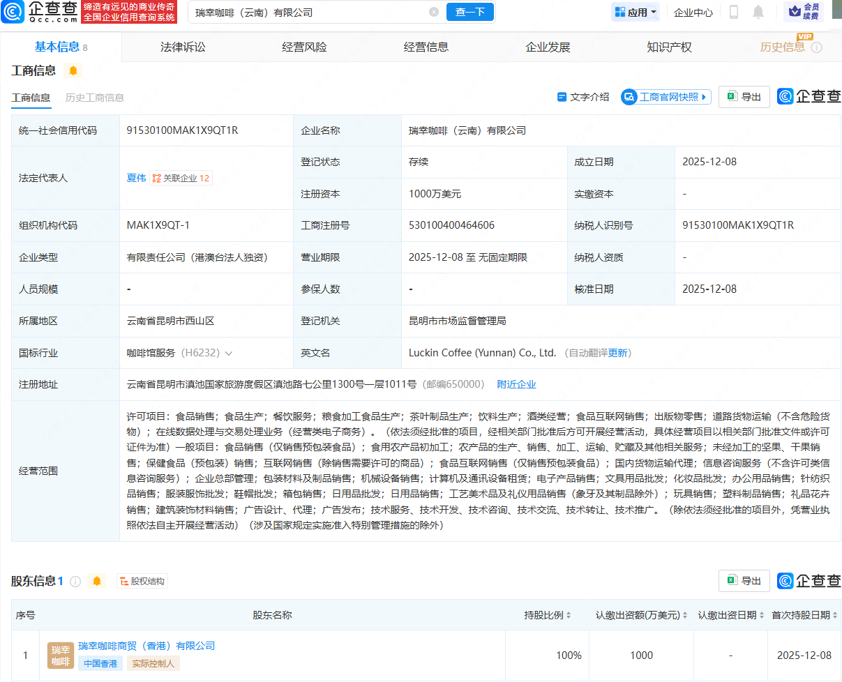 企查查APP显示,近日,瑞幸咖啡(云南)有限公司成立,法定代表人为夏伟,注册资本为1000万美元,经营范围包含:食品销售;食品生产;餐饮服务;粮食加工食品生产;茶叶制品生产;饮料生产;酒类经营等。企查查股权穿透显示,该公司由瑞幸咖啡商贸(香港)有限公司全资持股。