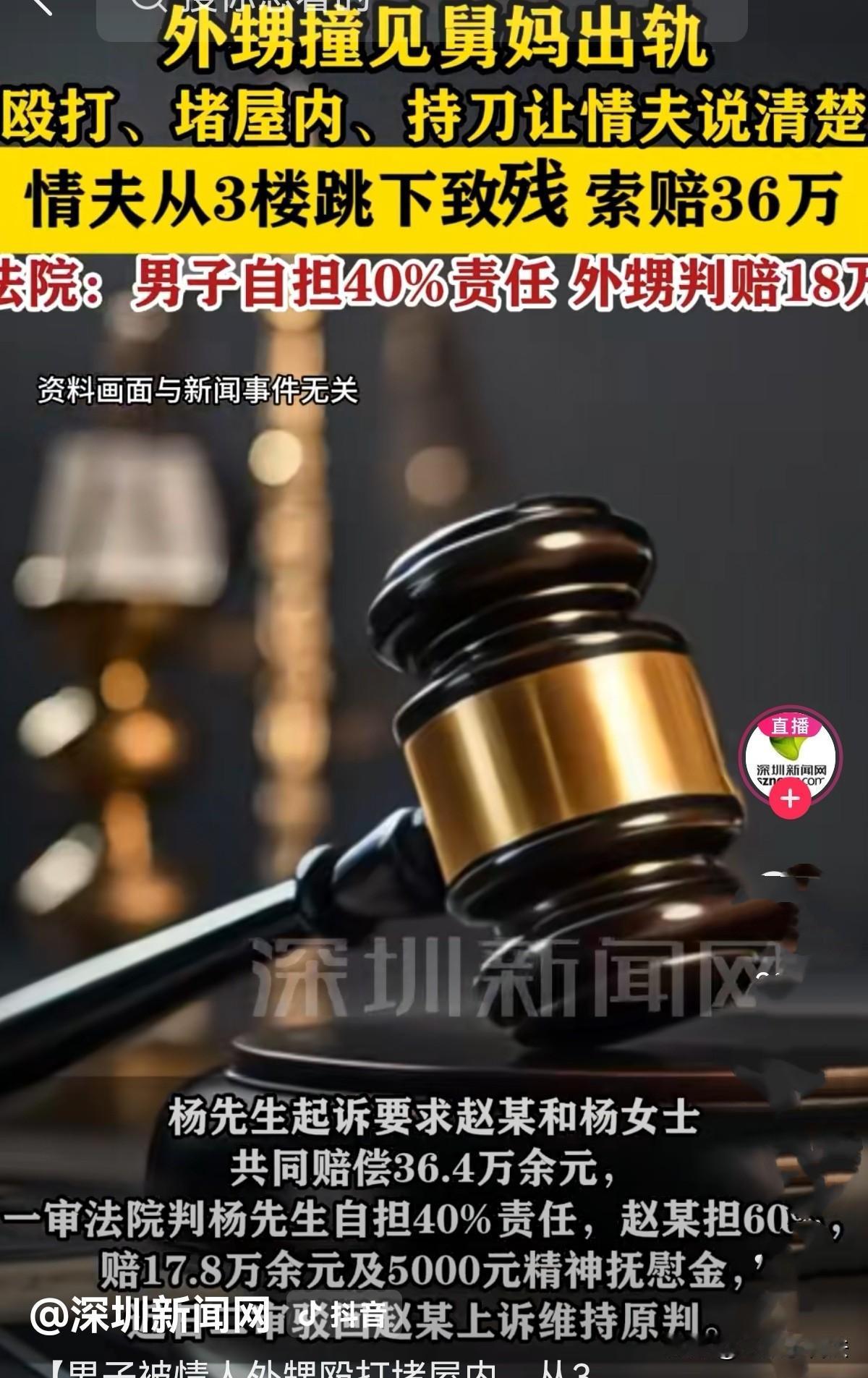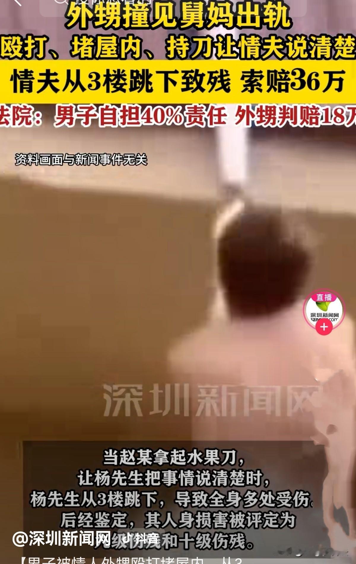 云南玉溪,36岁男子打工时与43女子发展成情人,经常留宿在女子的出租屋里。一日晚,他正在女子房中喝酒,女子外甥突然来了,愤怒地问他和舅妈是什么关系,让他说清楚。随后对他进行殴打,4次堵门不让他离开,还拿起水果刀逼问他。男子情急之下从3楼跳下,导致全身多处受伤,住院40天,伤情鉴定为九级伤残和十级伤残。随后男子将女子及其外甥告上法庭,索赔36万。法院判了! 2024年10月22日晚6时许,36岁的杨先生正在情人杨女士的出租屋里喝酒吃饭,他一脸享受地品着美酒佳肴,两人聊着暧昧的情话。 9点时,房门突然被猛地推开,闯进来的是杨女士的外甥赵某。 你是谁?在我舅妈屋里干啥?赵某一看房间有个陌生男人,一股无名火涌上心头,他怒目圆睁地指着杨先生让他讲清楚,他俩是什么关系! 杨先生被这突如其来的情况吓得手里的酒杯差点掉地上。赵某206多斤体重,彪悍魁梧,只有116斤的杨先生在他面前如一个小鸡子似的,吓得瑟瑟发抖。 杨先生与43岁的杨女士是半年前打工时认识的,明知双方都有家庭,两人还是发展成了情人关系。 杨先生偶尔在杨女士出租屋留宿,本以为神不知鬼不觉,没想到被女方家人撞了个正着。 杨先生脑子飞速运转,想找到借口解释,可话到嘴边又咽了回去,这种关系怎么说都理亏。 他想趁机溜走,却被赵某一把扯回:想跑?把话说清楚!杨先生低着头不吭声,越是沉默,赵某的火气越盛。 争执拉扯中,赵某一把揪住杨先生的衣领,拳头直往他头上、脸上招呼,鼻梁瞬间流出血来。 杨先生被打得晕头转向,想反抗却不是身材健硕的赵某的对手。赵某又猛地将他推倒在床上,双手掐住他的脖子,窒息的恐惧感让杨先生拼命挣扎。 好不容易从床上爬起来,他朝着门口冲去,可赵某已堵在门口,将他硬生生拉回来。 出租屋本来就狭小,被赵某堵得无路可退,更让他胆寒的是,赵某转身从桌上抄起一把水果刀:不说清楚别想走!赵某威胁着一步步逼近。 杨先生退到窗边,他能感觉到自己的腿在发抖,脑子里只有一个念头:再不跑可能就没命了。 杨女士在一旁急得团团转,死死抱着赵某的胳膊劝阻,可赵某力气太大,挣脱着还要往前冲。 杨先生4次试图从门口突围,都被赵某拦住,心理防线彻底崩溃! 在赵某再次挥着刀逼近的瞬间,他没多想,推开窗户就跳了下去。 “砰”的一声闷响,杨先生臀部着地,剧痛瞬间传遍全身,眼前一黑差点晕过去。 赵某和杨女士赶紧跑下楼,赵某见状也慌了神,赶紧拨打了110和120。 醒来的杨先生强忍着剧痛想站起来,刚起身就摔了下去,可他顾不上疼痛,也不听杨女士的劝阻,挣扎着骑车离开了现场。 第二天,实在扛不住的杨先生被送到医院,门诊花了867.92元。可他的伤情远比想象中严重,一住就是40天。 脑水肿、L1爆裂骨折、肋骨骨折、左侧跟骨粉碎性骨折……诊断结果让他崩溃,光是住院费就花了79210.54元,加上门诊费、护理费…等,短短40天就花光了他所有积蓄。 更让他绝望的是,2024年12月11日鉴定结果显示,他的腰椎骨折构成九级伤残,颅脑损伤开颅术后构成十级伤残。 这意味着,他这辈子都无法像以前一样正常打工,未来的生活都成了问题。 思来想去,杨先生将赵某和杨女士告上了法庭,要求两人共同赔偿医疗费、残疾赔偿金等损失共36.4万余元。 他觉得,自己变成这样都是赵某殴打、威胁造成的,杨女士作为情人,也该承担责任。 《民法典》第1165条第1款:行为人因过错侵害他人民事权益造成损害的,应当承担侵权责任。 法院审理认为,杨先生和杨女士的婚外情确实违背社会道德,但这绝不能成为赵某动手的理由。 赵某对杨先生实施殴打、掐脖子、持刀威胁的行为,已侵犯了他人身体健康权,而赵某身材健硕,杨先生4次尝试开门逃生未果。 面临持刀威胁的情况下,内心必然产生巨大恐惧,跳楼是他在紧急情况下的正常反应,与赵某的侵权行为存在直接因果关系。 《民法典》第1173条:被侵权人对同一损害的发生或者扩大有过错的,可以减轻侵权人的责任。 杨先生明知杨女士未离婚仍发展情人关系,是引发矛盾的根源;面对赵某的质问,他没有采取缓和矛盾的方式,反而选择回避,加剧了事态发展。 而且在杨女士劝阻期间,他本可以选择报警等更安全的自救方式,却选择了跳楼,作为成年人,他可预知跳楼的后果,自身存在一定的过错。 经审理法院酌情认定,杨先生自行承担40%的责任,赵某承担60%的责任。 而杨女士在整个过程中一直劝阻赵某,没有实施侵权行为,主观上没有过错,不承担赔偿责任。 最终法院判决:核定杨先生各项损失共30.04万余元,赵某需赔偿18.02万余元,扣除已支付的2008元,还应赔偿17.8万余元。加上5000元精神损害抚慰金。 赵某不服一审判决提起上诉。二审驳回上诉维持原判。 对此您怎么看?