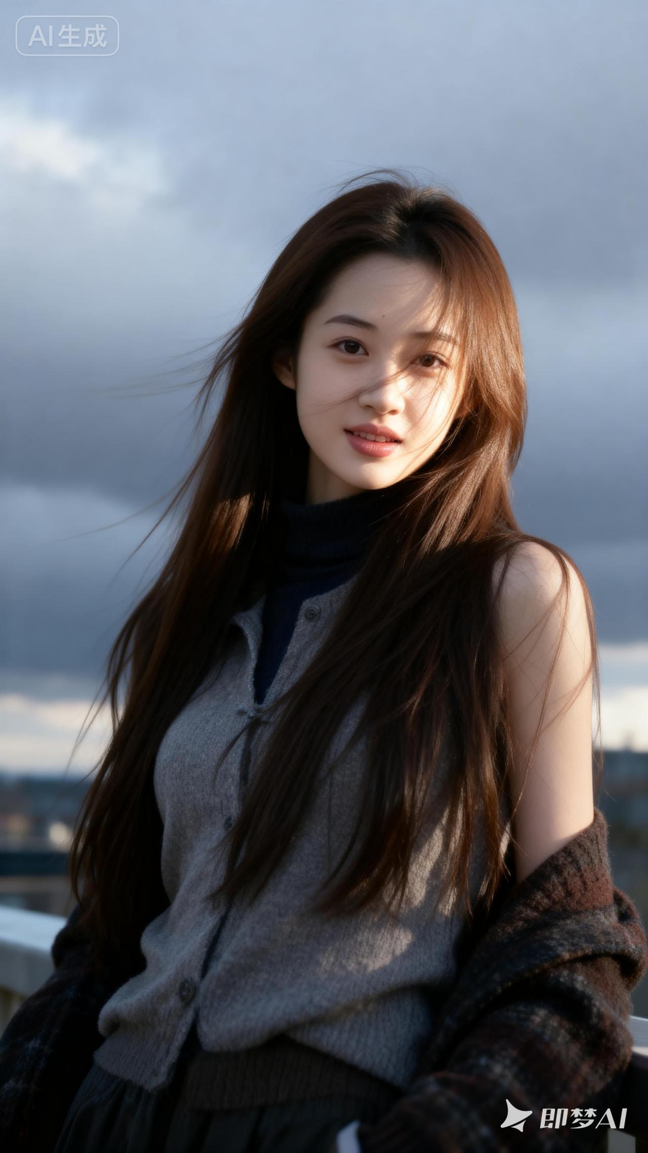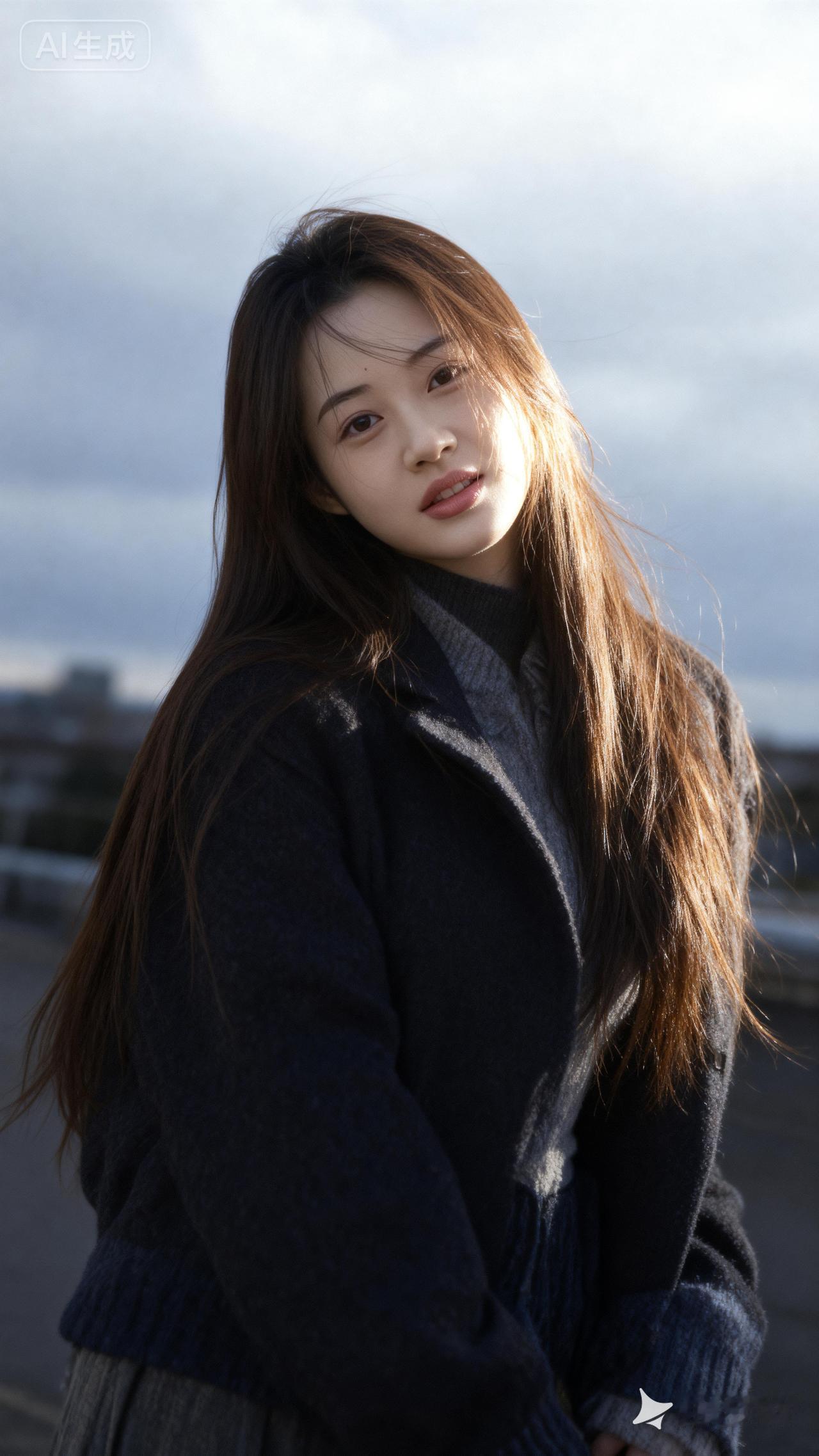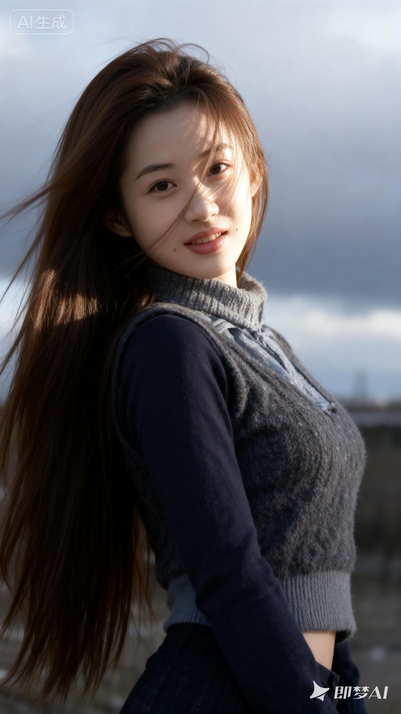 冬日暖阳下的甜美少女,温暖毛衣与长发相得益彰。