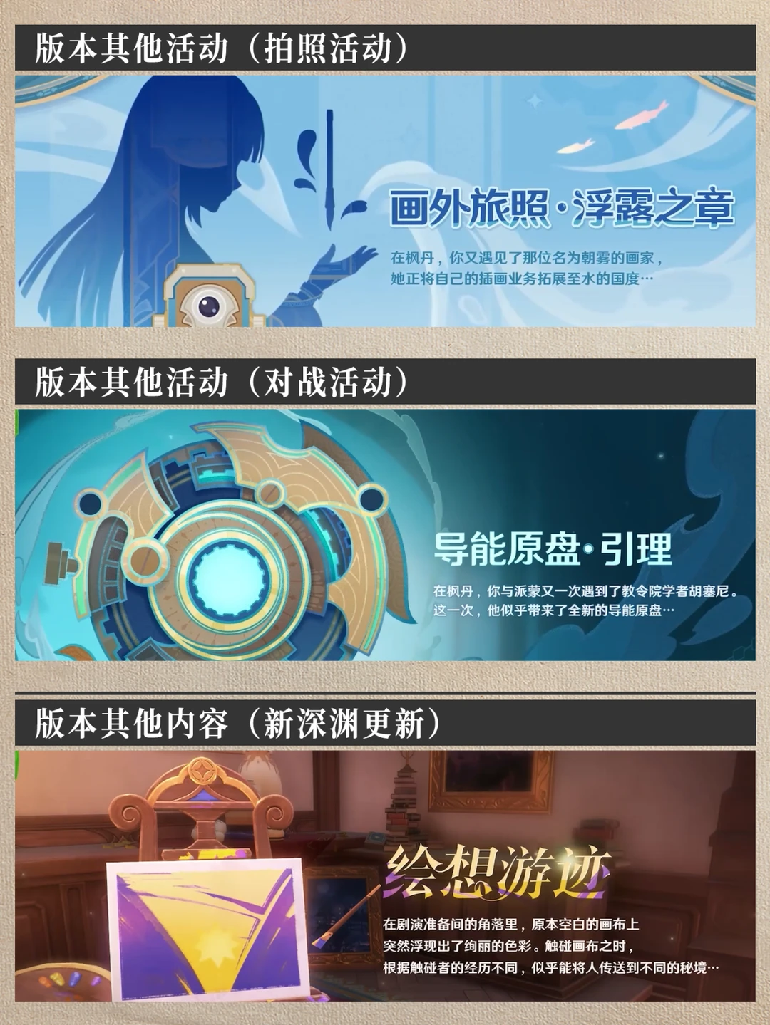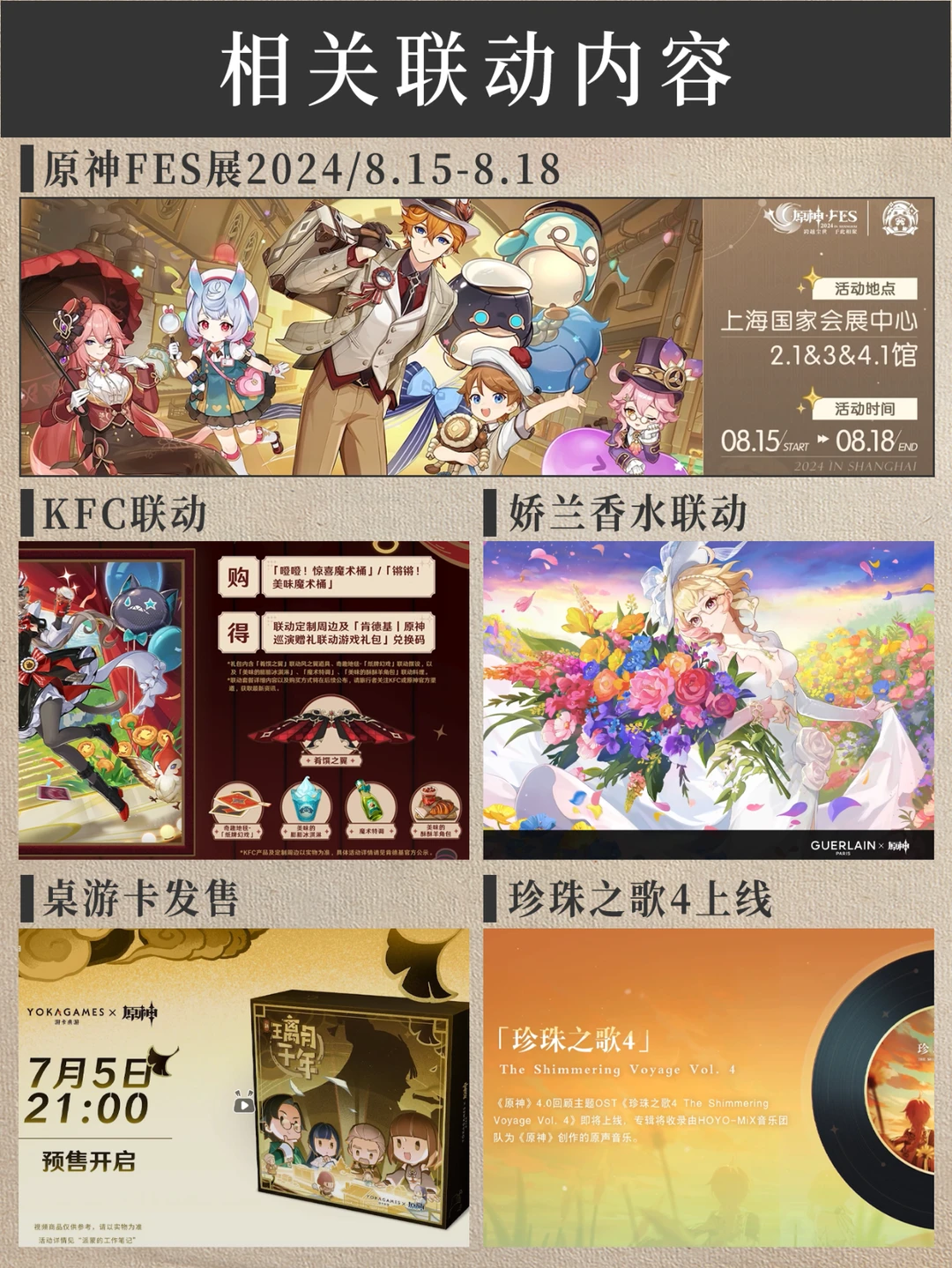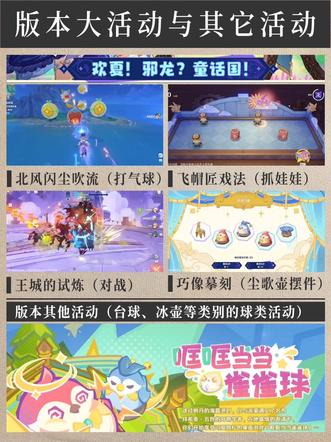 3.8版本活动省流版!快速了解下版本内容吧! 🎉卡池消息 上半:娜维娅 妮露 下半:艾梅莉埃(新) 夜兰 🎊版本大活动 北风闪尘吹流(打气球) 飞帽匠戏法(抓娃娃) 王城的试炼(对战) 巧像摹刻(用前三小活动获得星游币抽摆件) 🎞版本其他活动 哐哐当当雀雀球(台球、冰壶等球类活动) 导能原盘·引理(拍照活动) 绘想游迹(新深渊打完六幕可获得兑换道具) 🍔联动活动 原神FES展 KFC联动 娇兰香水联动 桌游卡发售 珍珠之歌4上线